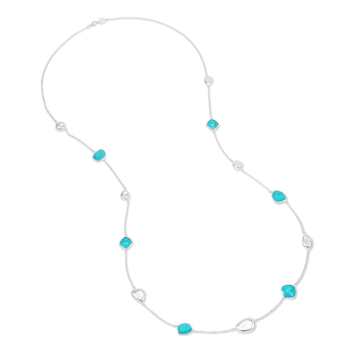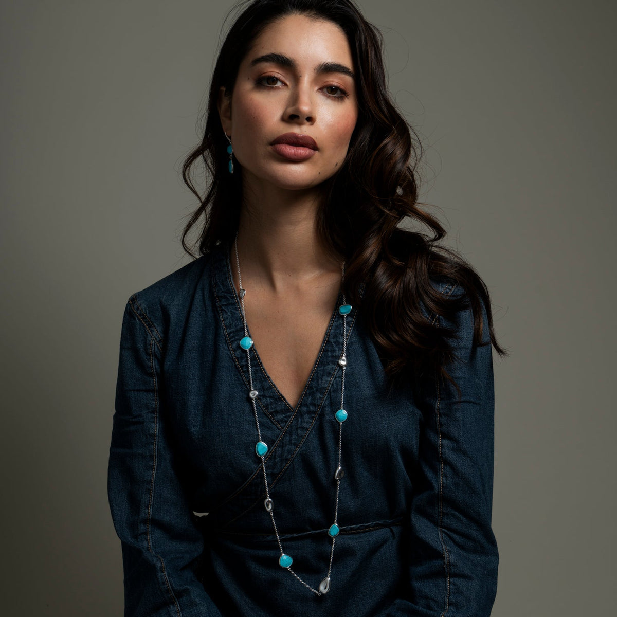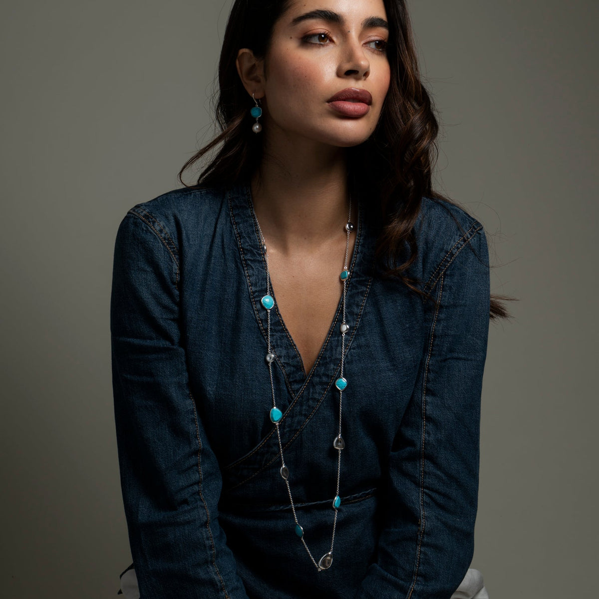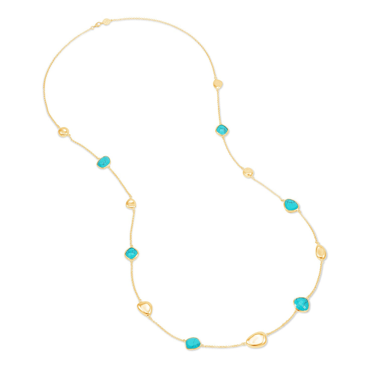 This Turquoise Gemstones & Pebbles Long Necklace by Dower & Hall features sculpted pebble pods and vibrant turquoise gemstones, creating a striking and colorful design. The necklace is versatile and can be worn as a long elegant single strand or doubled for a shorter look. This piece is perfect for those who love to make a bold yet understated statement with their jewelry.