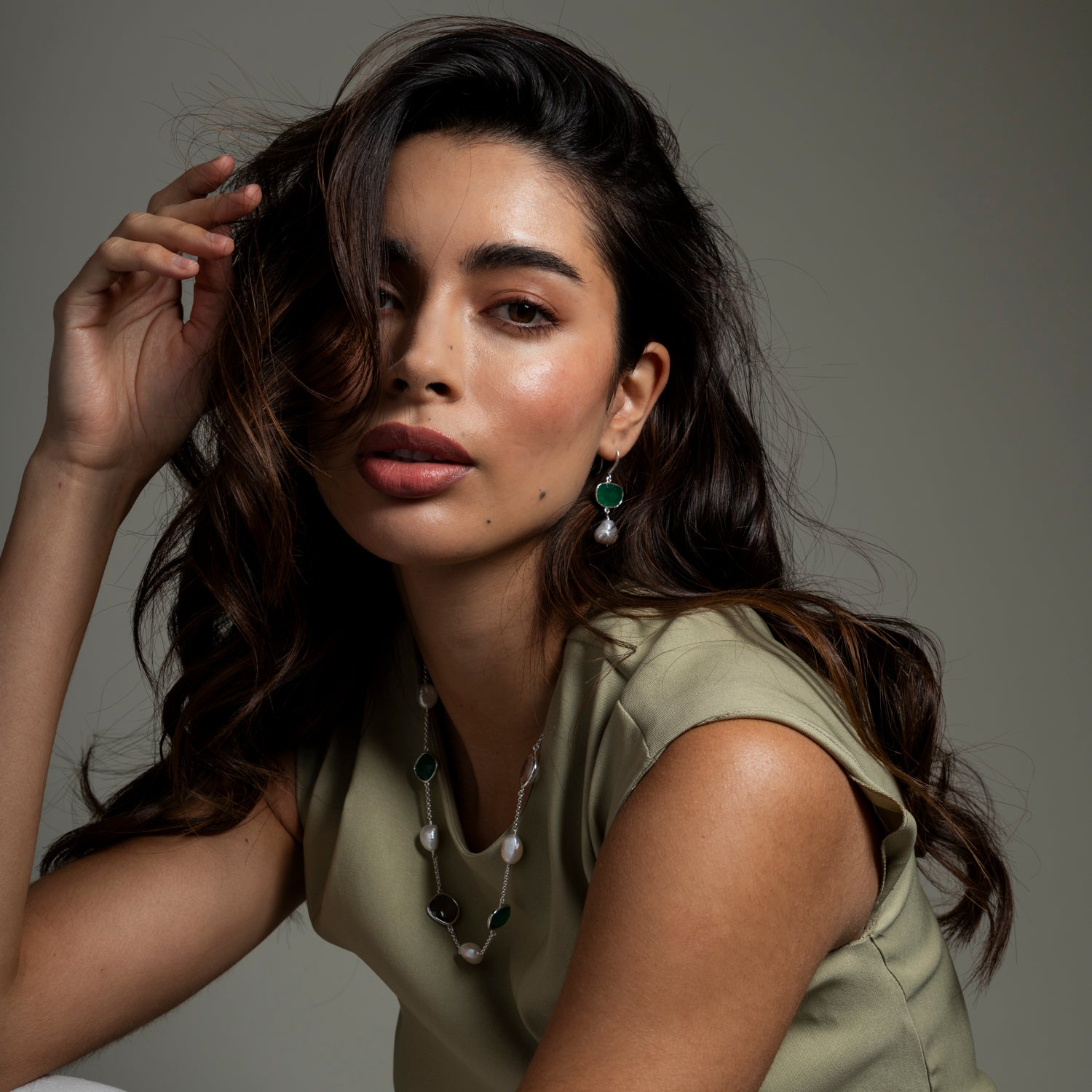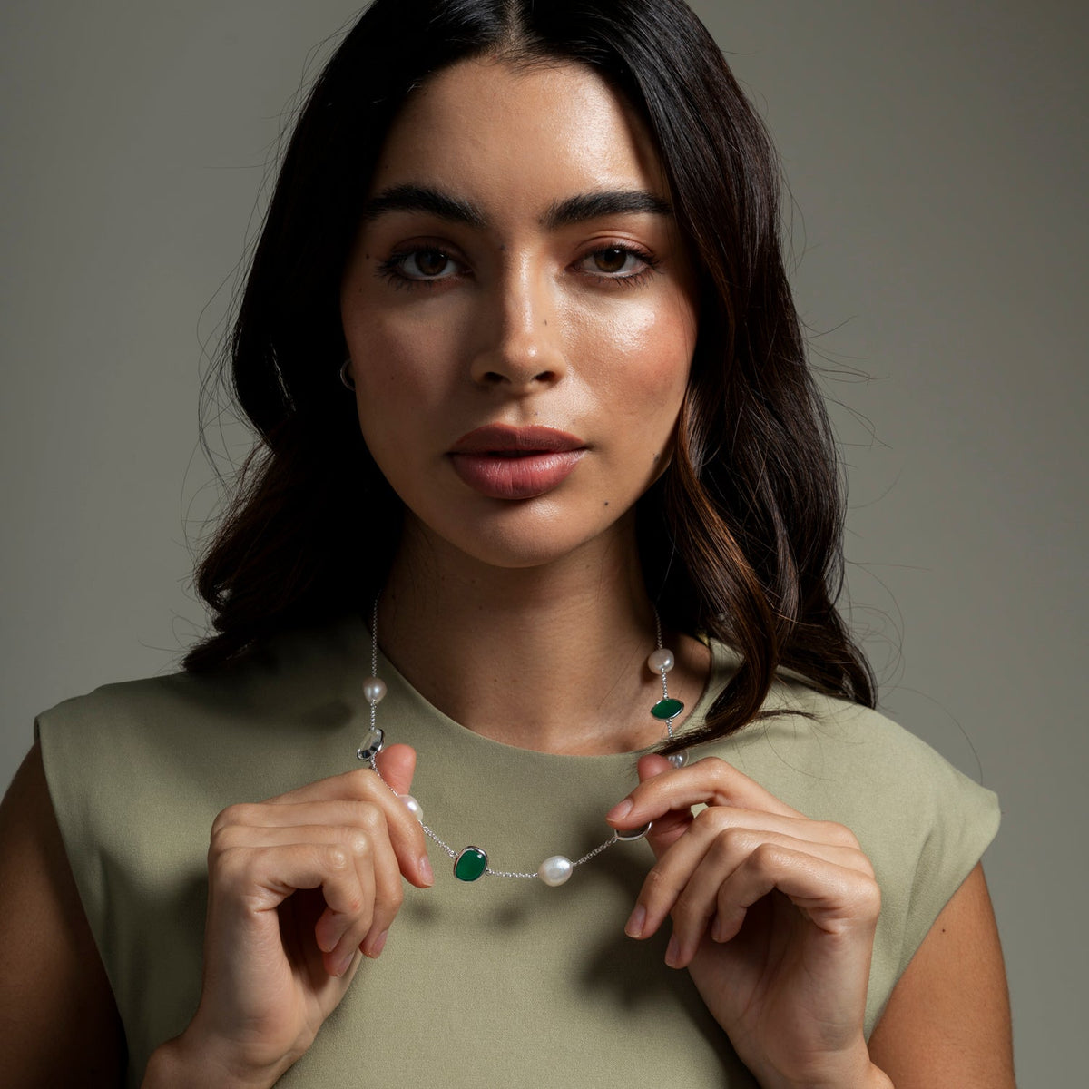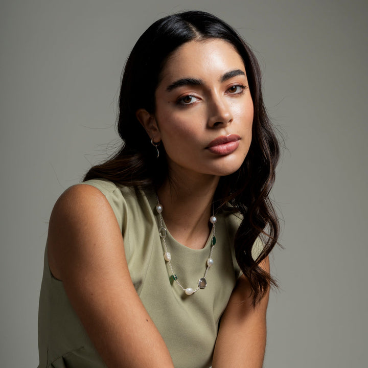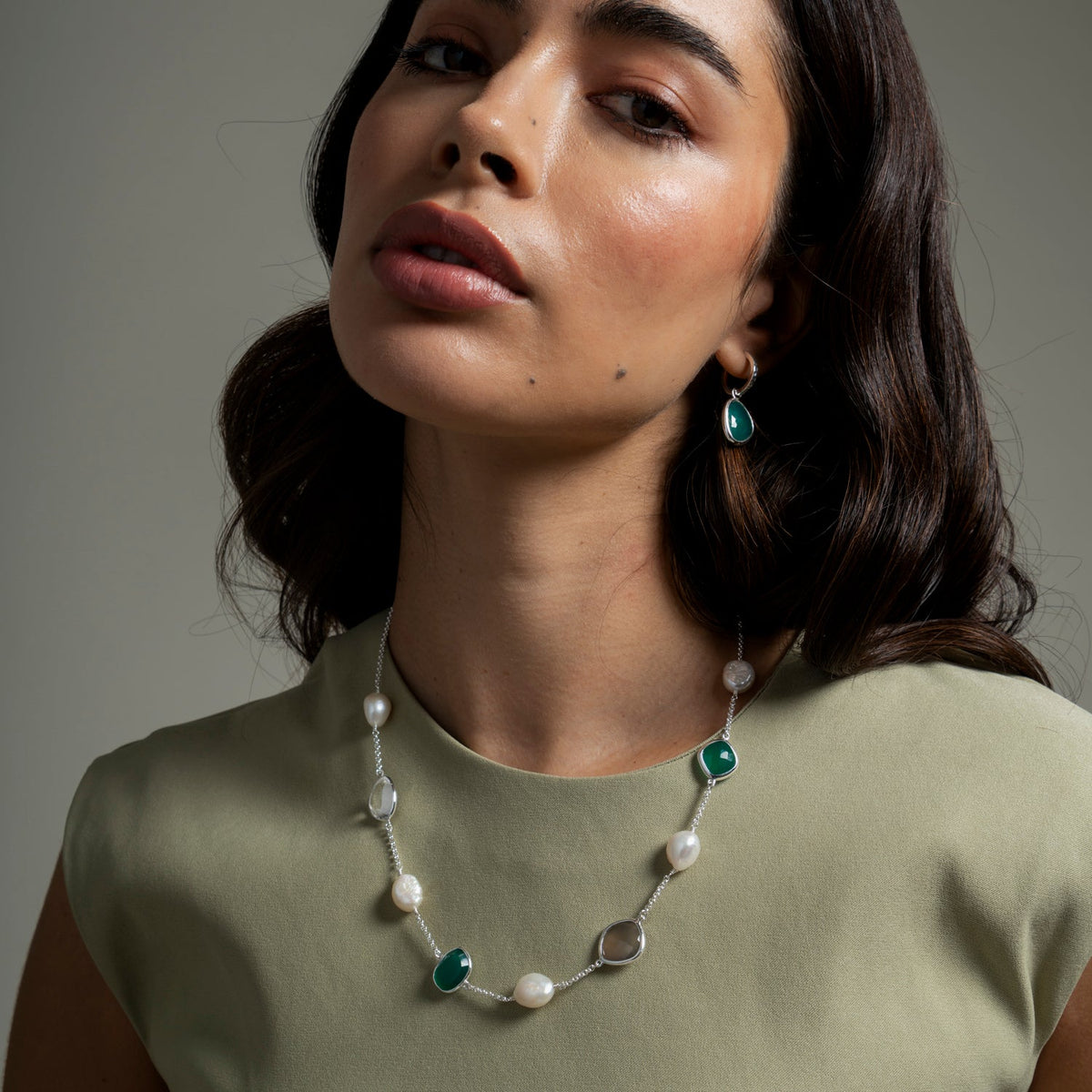 This Green Gemstone & Baroque Pearl Pebble Necklace by Dower & Hall features a beautiful blend of earthy green gemstones and the lustrous elegance of white baroque pearls. The mix of green onyx, grey agate, lemon quartz, and rock crystal gemstones creates a sophisticated yet vibrant look. Baroque pearls, with their one-of-a-kind shape, make this piece even more special. Wear it alone or stack it with other necklaces for a personalized layered effect.
