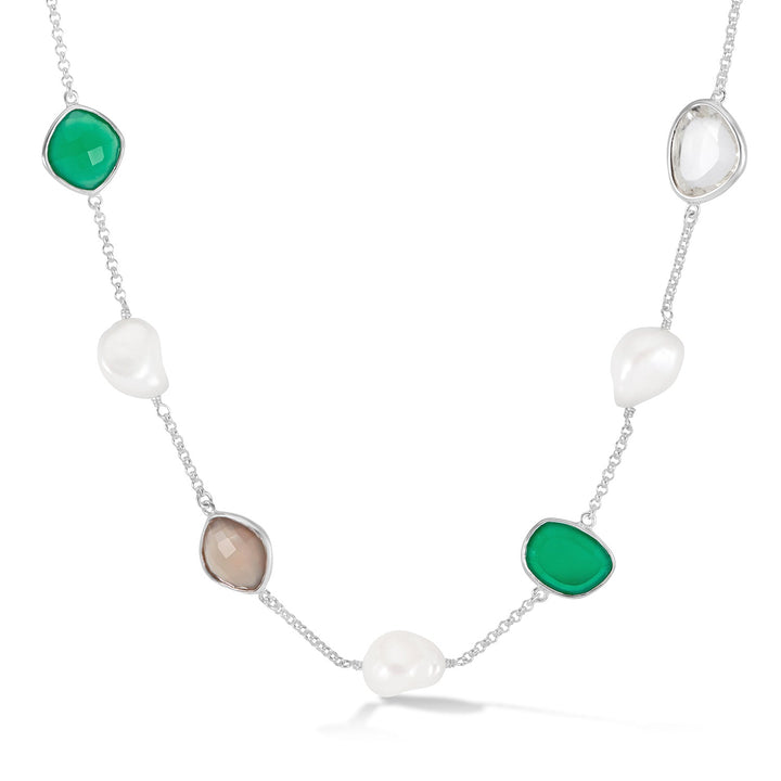 Handcrafted in sterling silver or with yellow gold vermeil finish. Five white baroque pearls and four faceted gemstones (green onyx, grey agate, lemon quartz, rock crystal). Pebble sizes: 10mm, 15mm, 20mm. Gemstone sizes: 10-14mm.