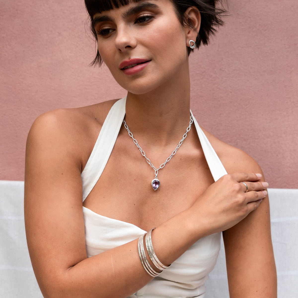 Handcrafted in sterling silver. Featuring a 16 x 12mm pear-cut amethyst gemstone. Suspended on a chunky chain with long links and a textured finish. Finished with a quatrefoil lobster catch.