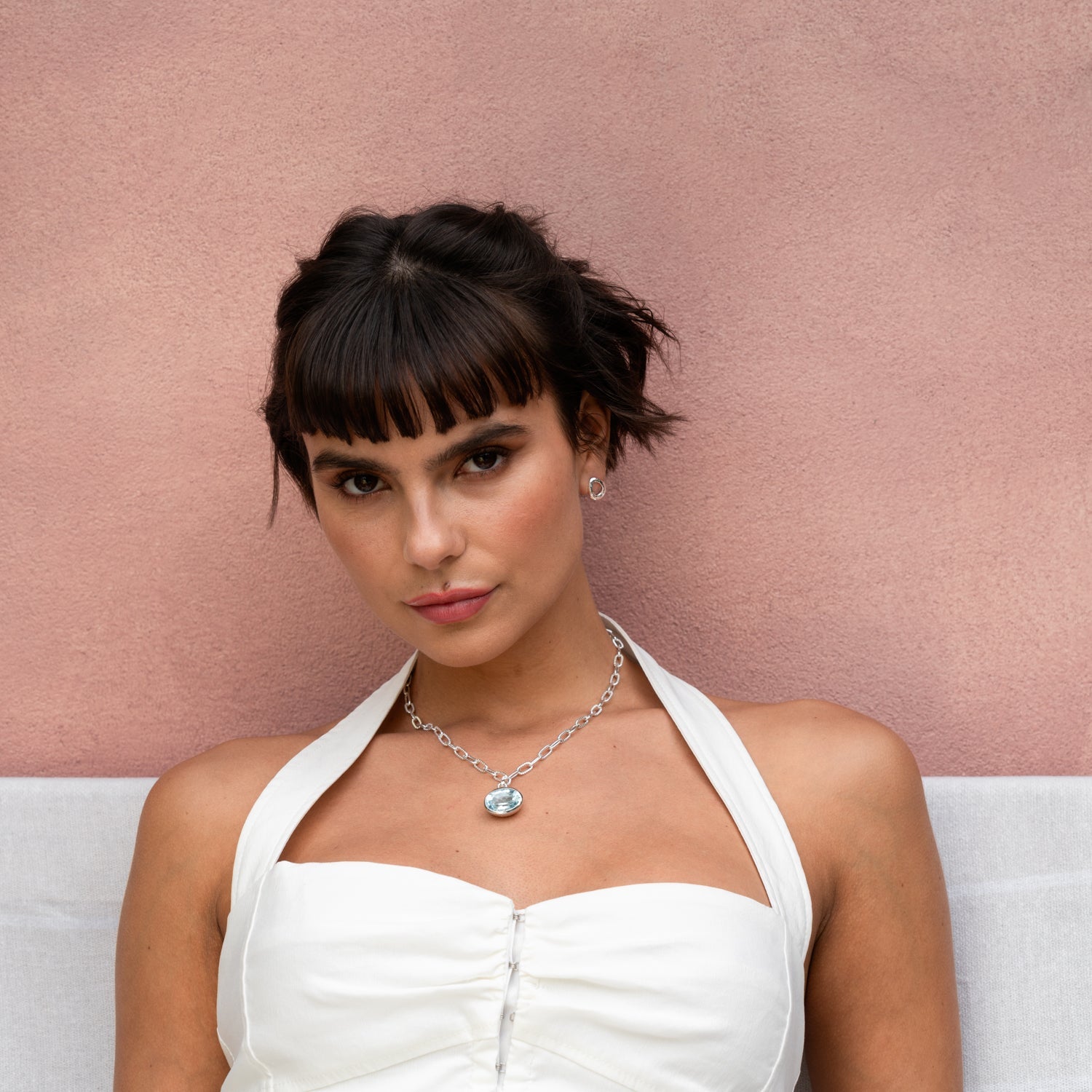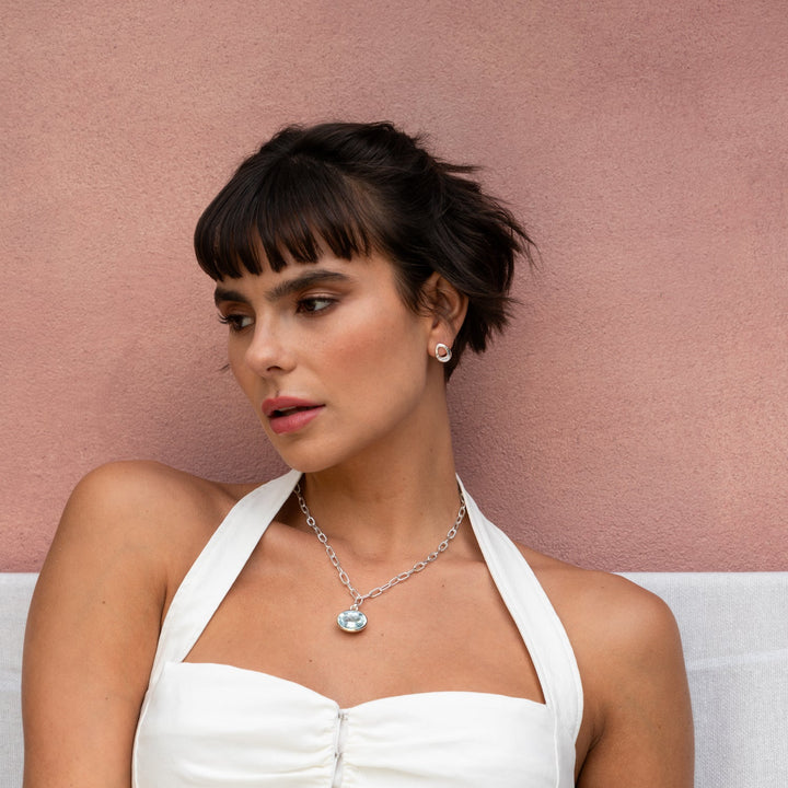 Handcrafted in sterling silver. Featuring a 13 x 18mm oval blue topaz gemstone. Suspended on a chunky chain with long links and a textured finish. Finished with a quatrefoil lobster catch.