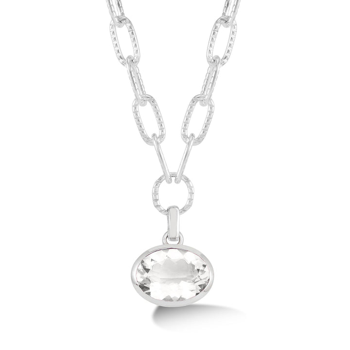 Handcrafted in sterling silver. Featuring a 13 x 18mm oval white topaz gemstone. Suspended on a chunky chain with long links and a textured finish. Finished with a quatrefoil lobster catch.