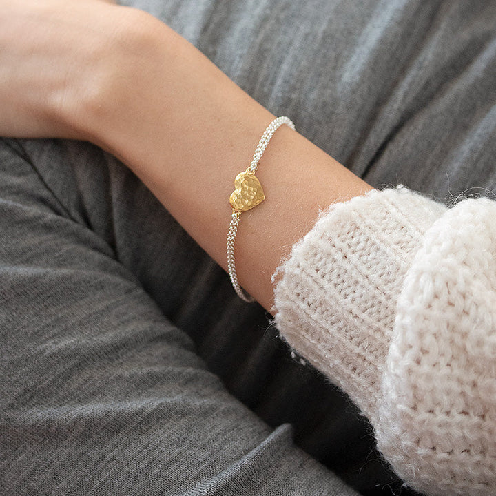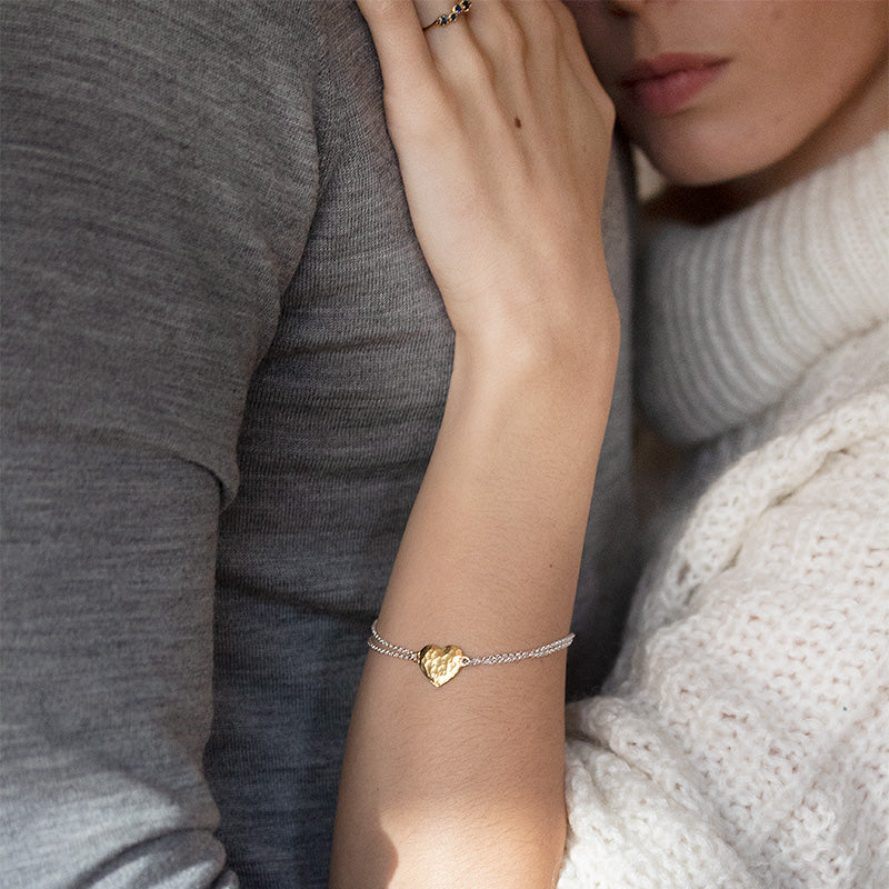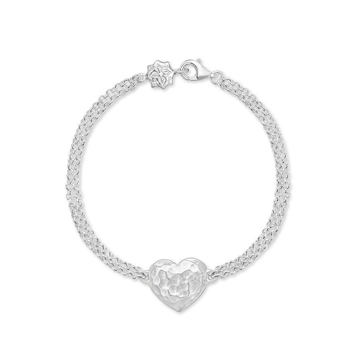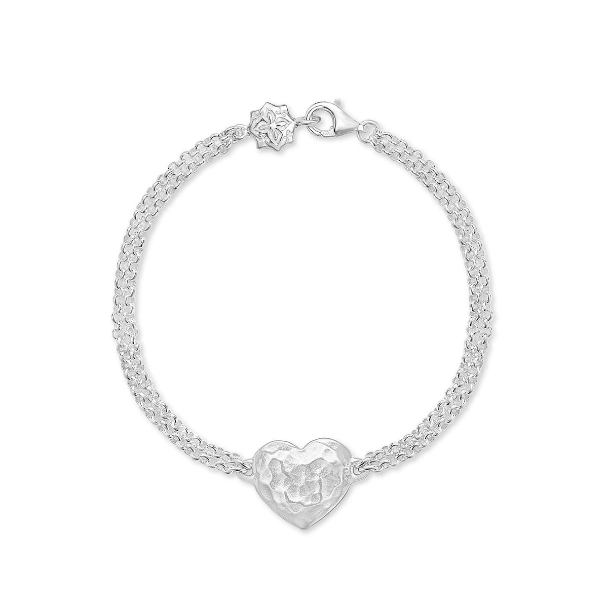 This Engravable Heart Chain Bracelet by Dower & Hall is a heartfelt piece, featuring a flat heart charm with a signature hammered texture. The bracelet is customizable, allowing you to engrave initials, names, dates, or special messages. A perfect gift or personal keepsake.