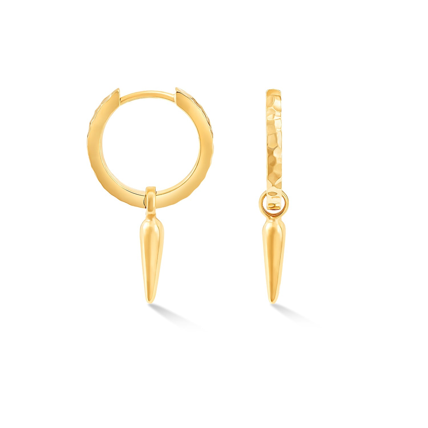 These Hammered Raindrop Hoops by Dower & Hall feature handcrafted sterling silver hinged huggie Nomad hoops with a signature hammered texture, complete with matching 10mm raindrop charm drops. Available in either sterling silver or 18ct yellow gold vermeil, these hoops offer a unique, textured look.