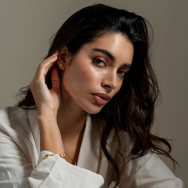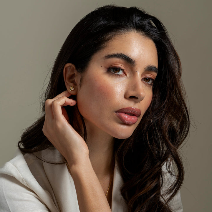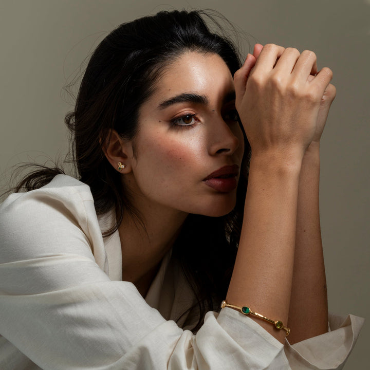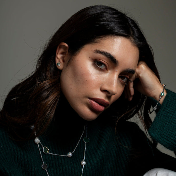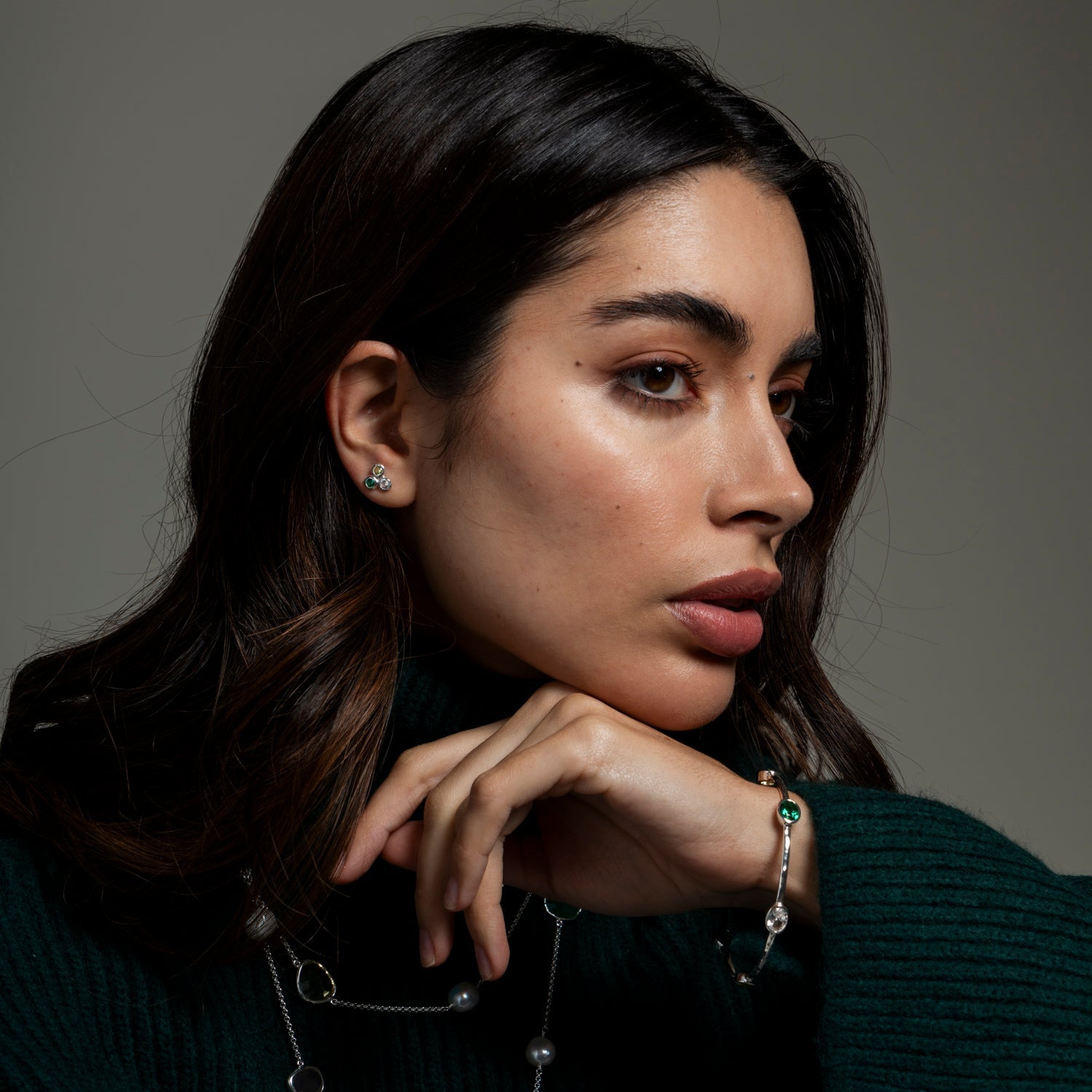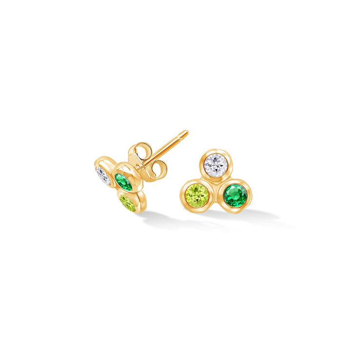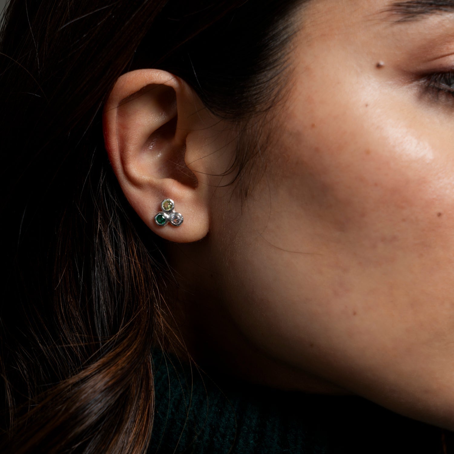 These Greens' Array Trio Studs by Dower & Hall are part of the Array collection, showcasing a beautiful combination of green garnet, peridot, and white topaz gemstones. Handcrafted in sterling silver, these earrings offer a splash of color, adding a vibrant touch to your look. The secure post and butterfly back ensure they stay comfortably in place.