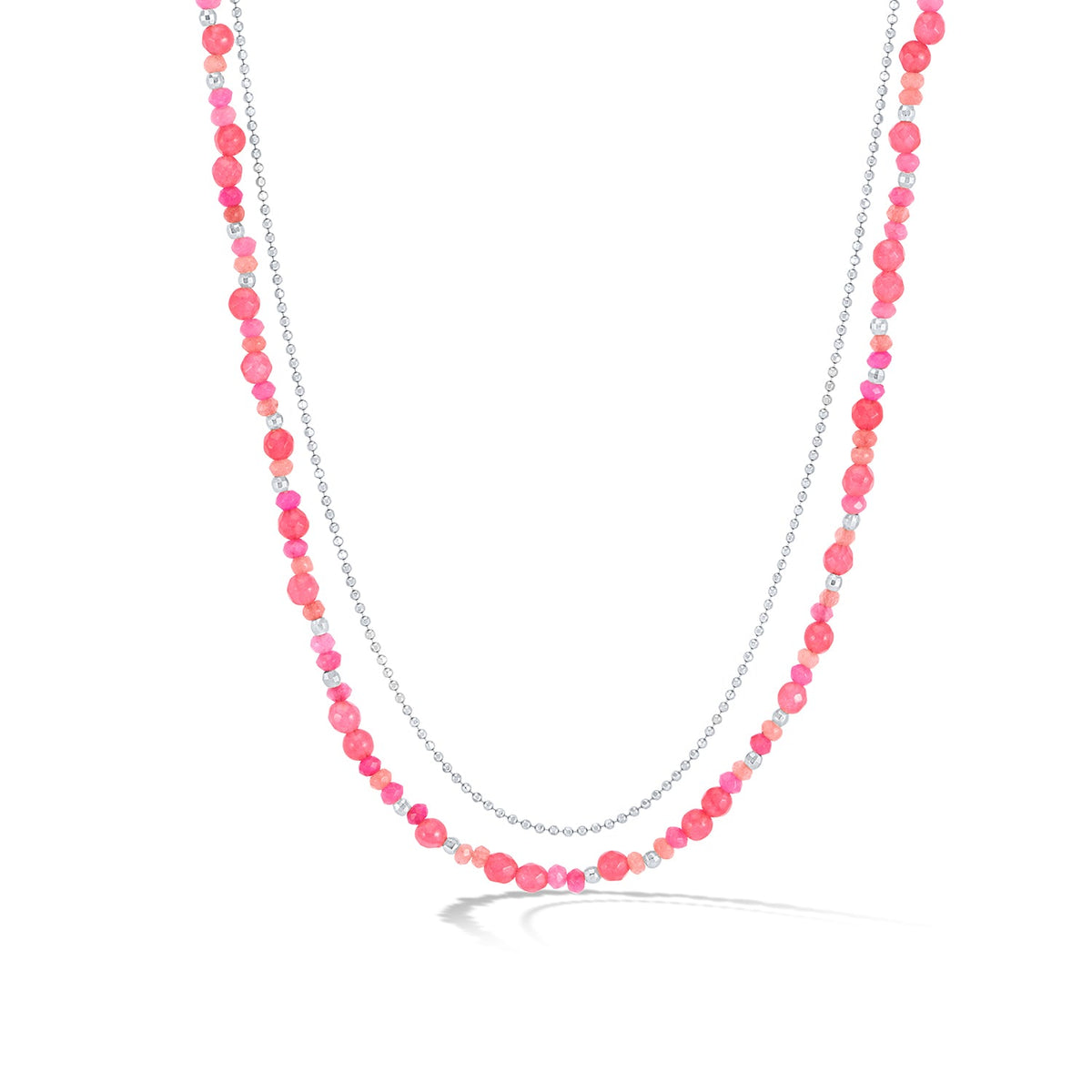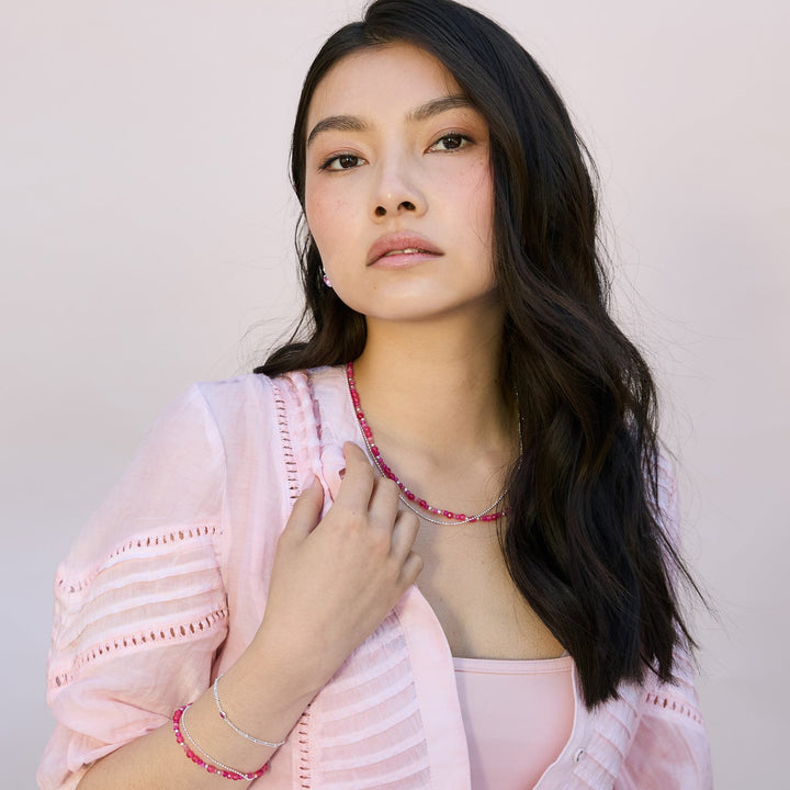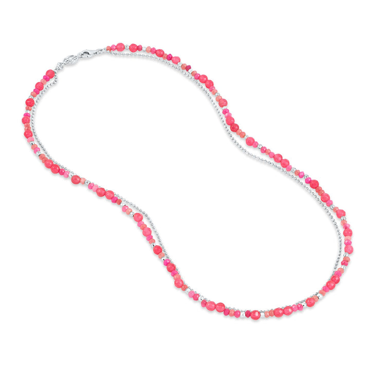 This Flamingo Orissa Necklace by Dower & Hall is a vibrant and colorful statement piece for the summer. Adorned with a mix of pink quartz gemstone beads, the necklace is complemented by sparkling sterling silver or yellow gold vermeil beads and chain. Complete with a signature lobster catch, it is perfect for adding a pop of color to any outfit.