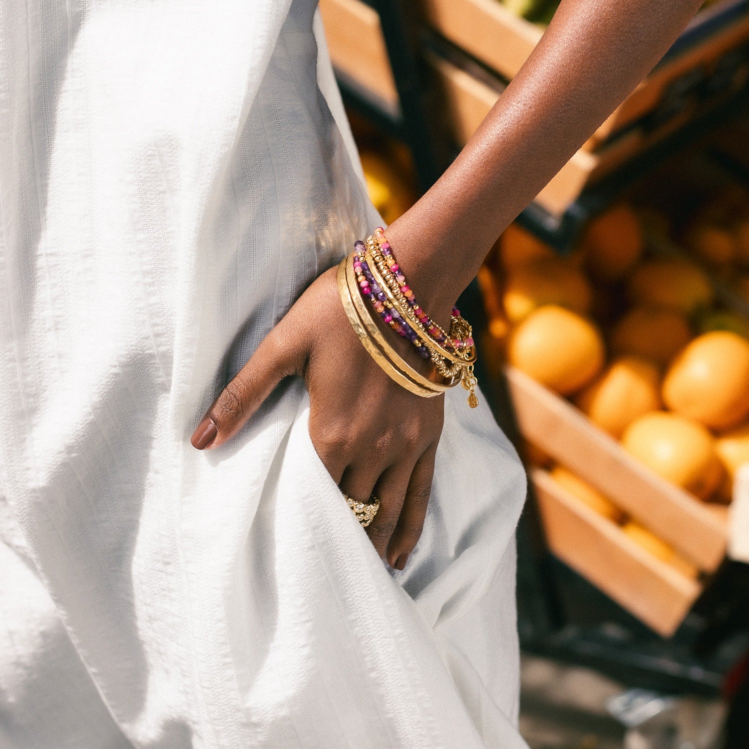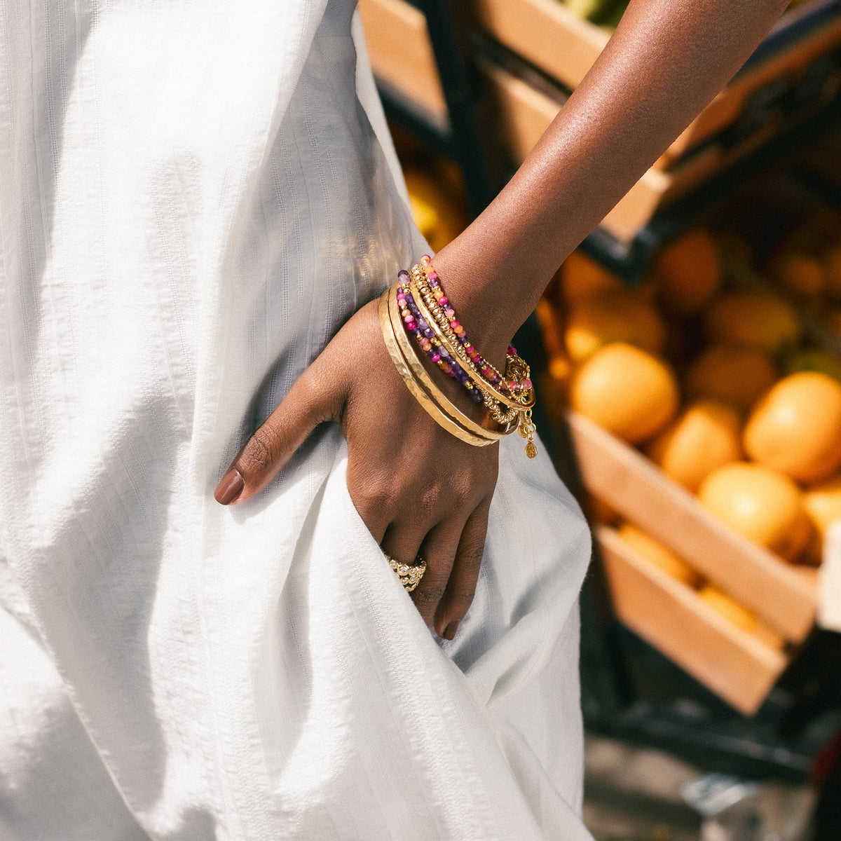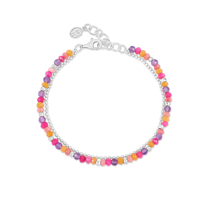 This Rio Orissa Bracelet by Dower & Hall embraces vibrant colors with a mix of faceted amethyst, pink quartz, and peach quartz gemstone beads. Handcrafted in our London studio, the colorful gems are complemented with sterling silver or yellow gold vermeil beads and chain, making it perfect for layering. Adjustable between 7-8 inches, this bracelet is complete with our signature lobster catch.