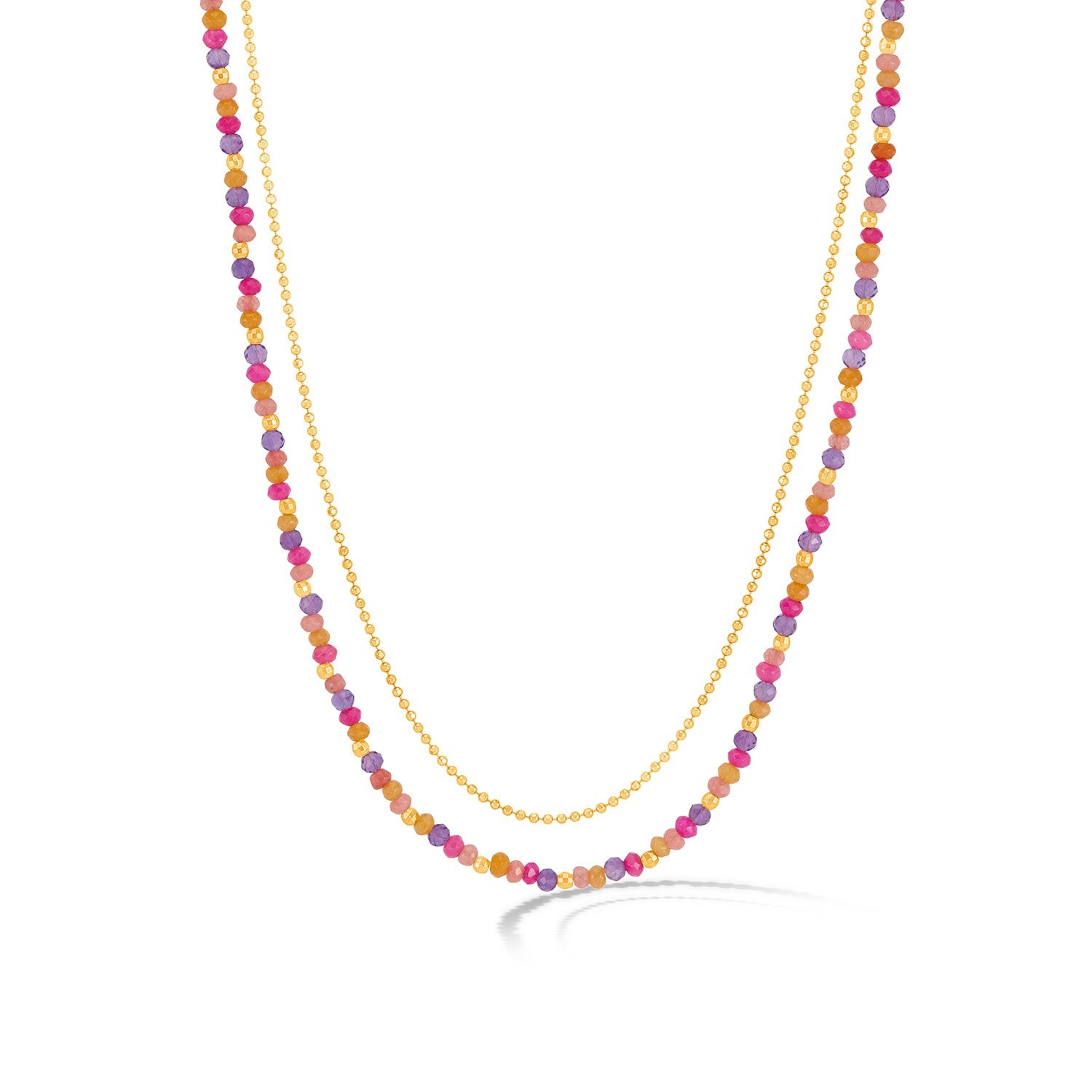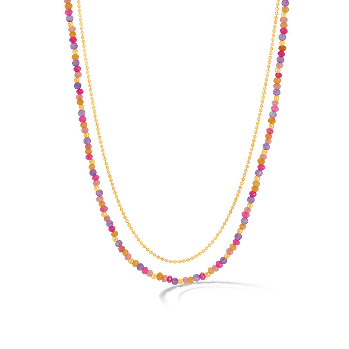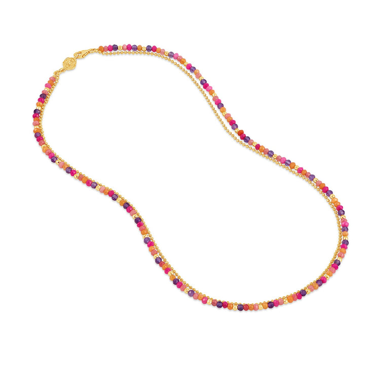 This Rio Orissa Necklace by Dower & Hall brings a vibrant, carnival-inspired energy to your collection. Handmade in our London studio, the necklace features a mix of faceted amethyst, pink quartz, and peach quartz gemstones, complemented with sparkling sterling silver or luxurious yellow gold vermeil beads and chain. Complete with a signature lobster catch, this piece is perfect for adding color to any outfit.