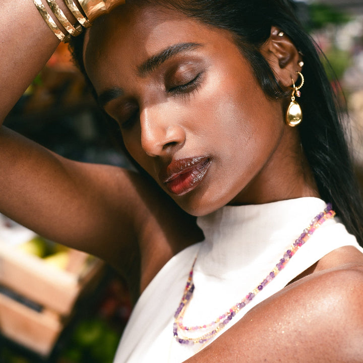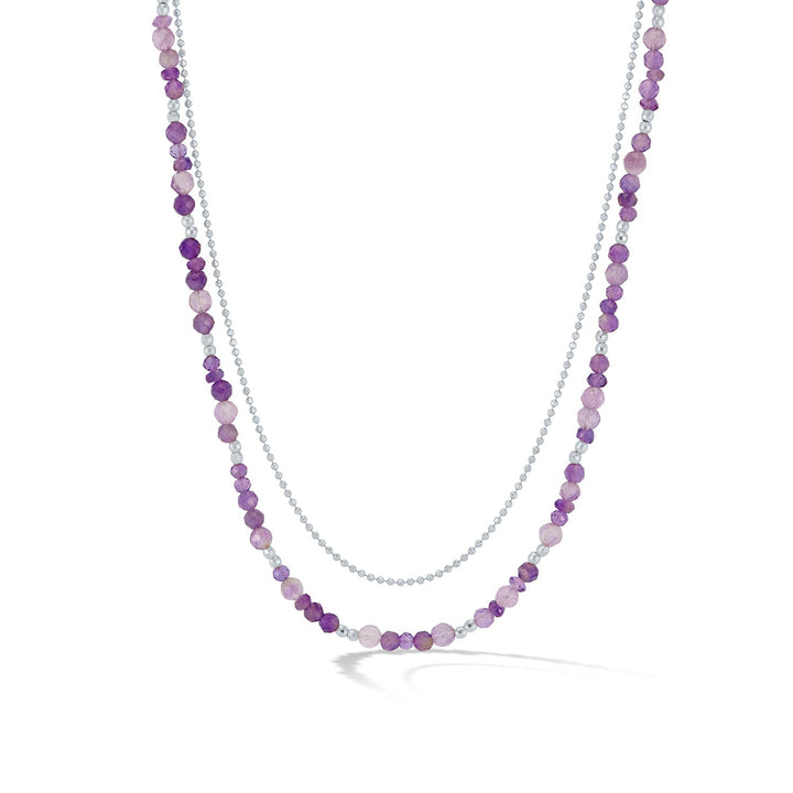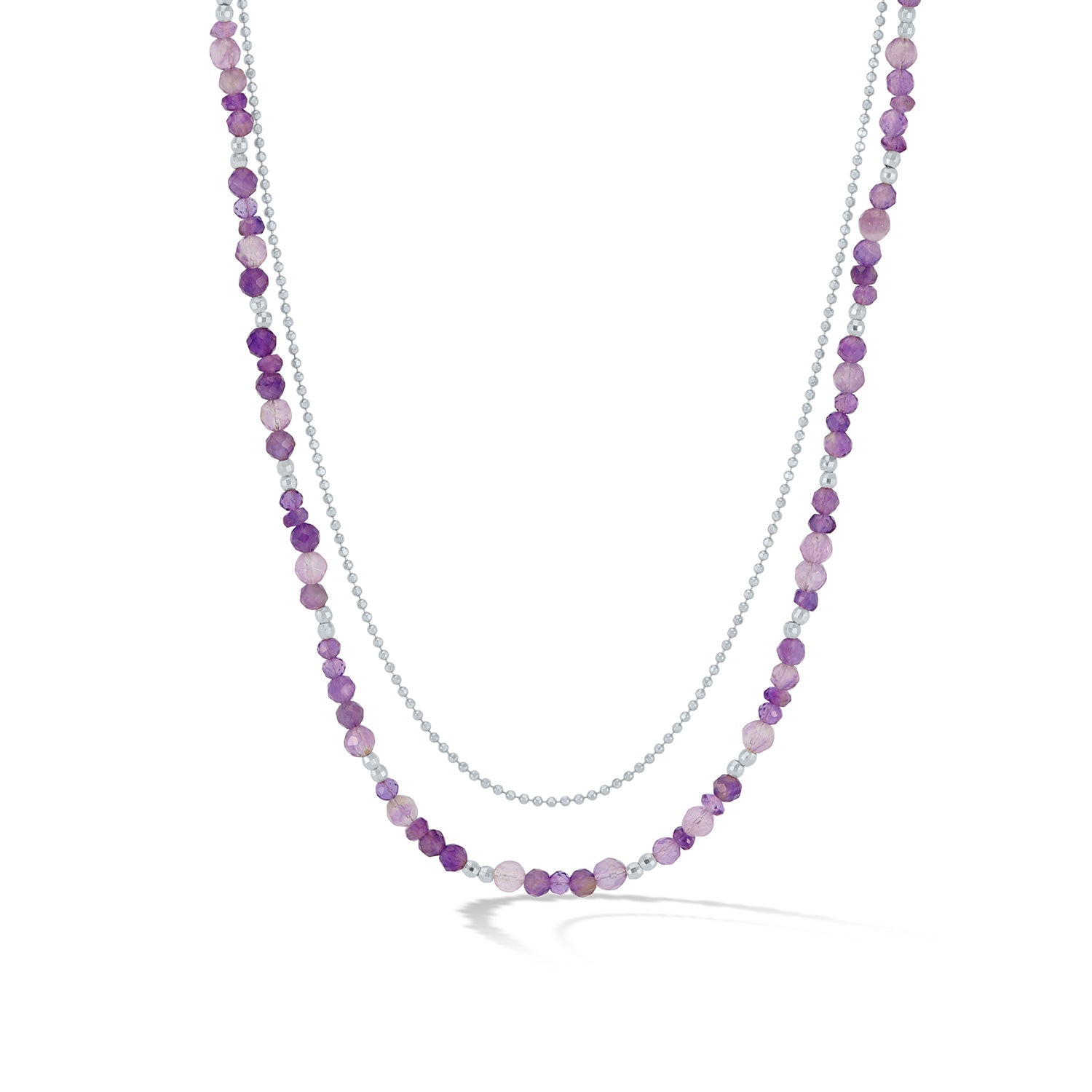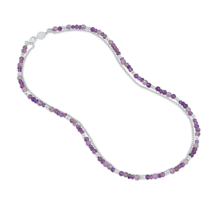 This Violet Orissa Necklace by Dower & Hall showcases the beauty of purple amethyst gemstones. Hand-threaded in their London studio, the necklace features a mix of amethyst beads and sparkling sterling silver beads that shimmer beautifully in the light. Whether dressed up or down, this elegant piece makes a striking addition to your jewelry collection. Finished with a signature lobster clasp for a secure fit.