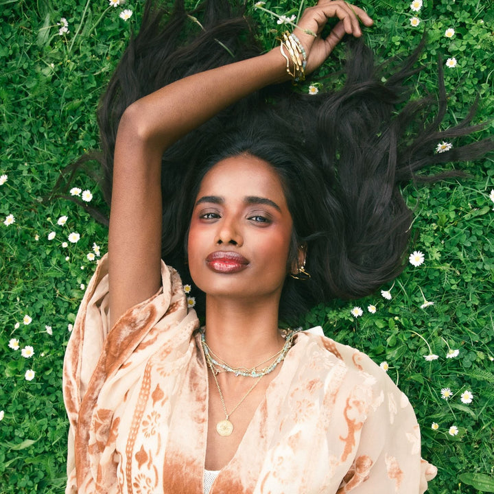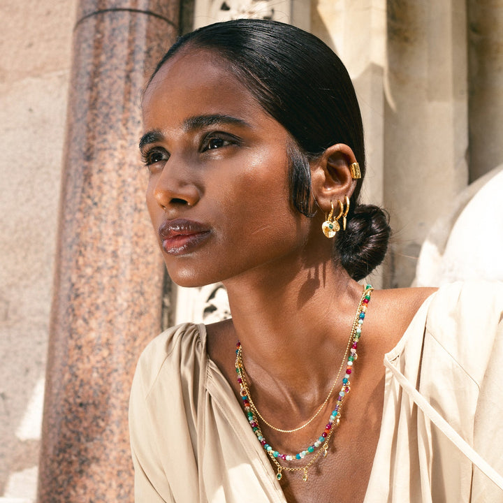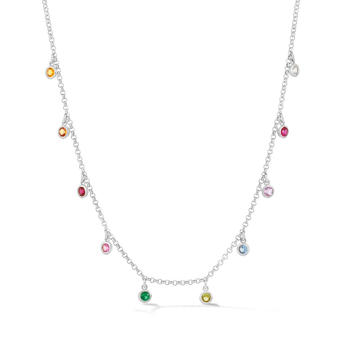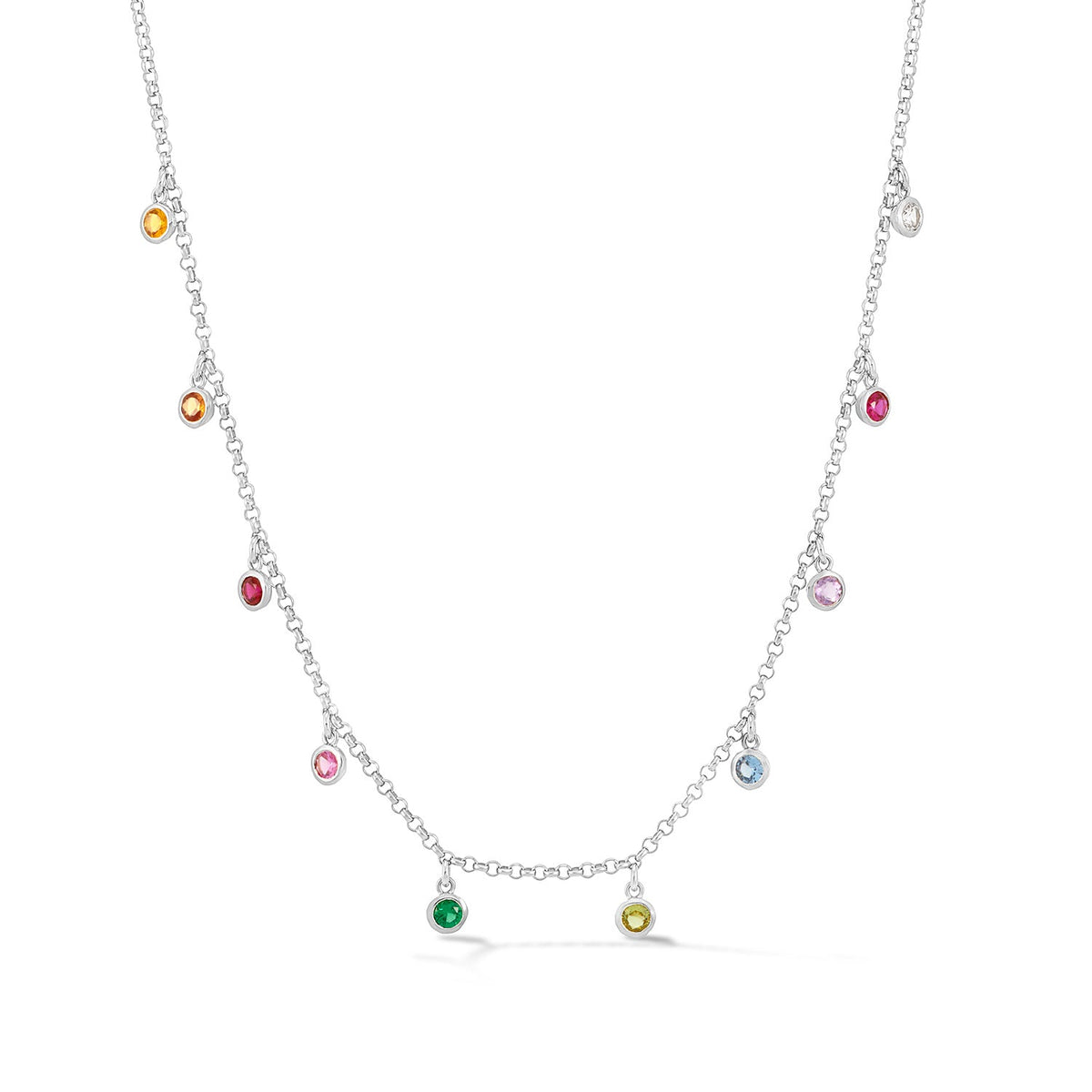 This Mixed Gemstone Array Chain Necklace by Dower & Hall embraces the colors of summer, featuring a rainbow of colorful gemstones including amethyst, aquamarine, garnet, peridot, tourmaline, citrine, and white topaz. These glistening gemstones are set in sterling silver or 18ct yellow gold vermeil, and the necklace is finished with a hammered loop and t-bar on a round belcher-style chain.