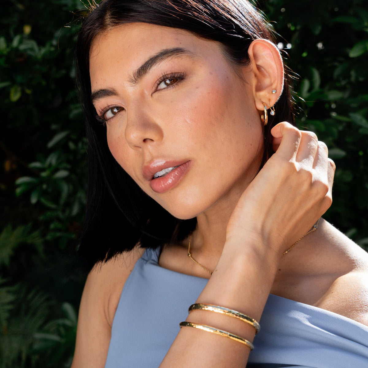 These 20mm Hammered Hoop Nomad Earrings by Dower & Hall are perfect for everyday wear with their double bar hoop design and signature hammered texture. Available in either sterling silver or with a rich 18ct yellow gold vermeil finish, these hoops are completed with post and butterfly backs for secure wear.