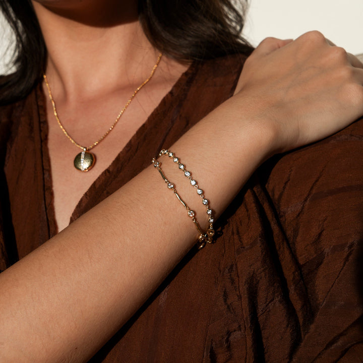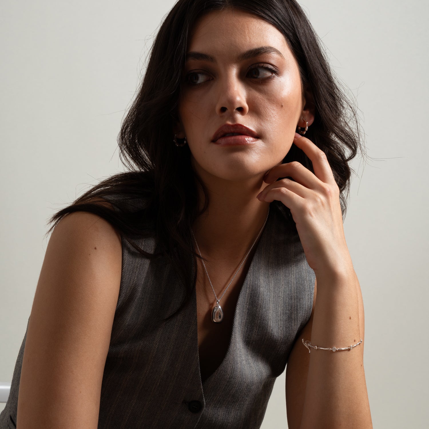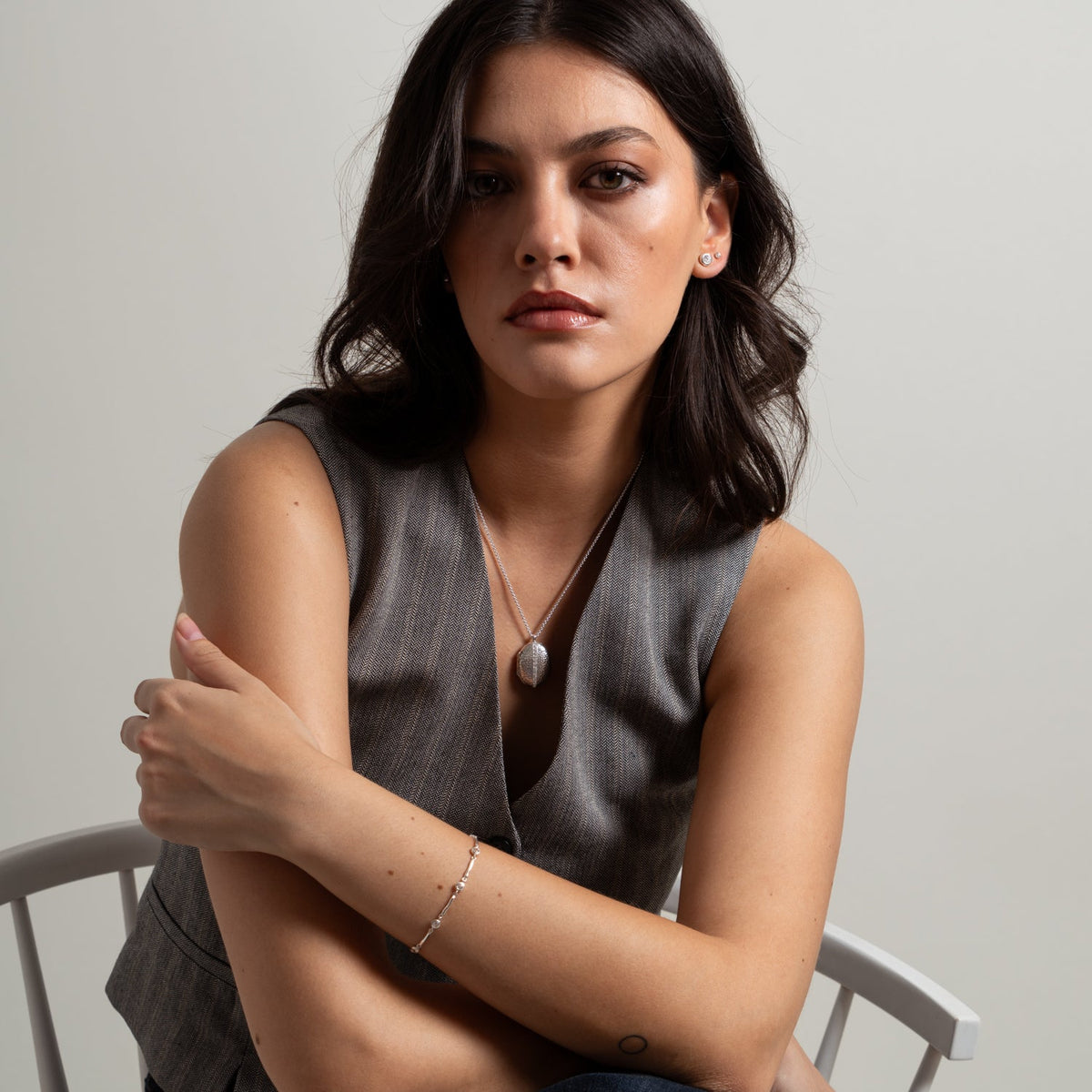 Handcrafted in sterling silver or with 18ct yellow gold vermeil finish. White sapphires (3mm). Total length: 7.25 inches.