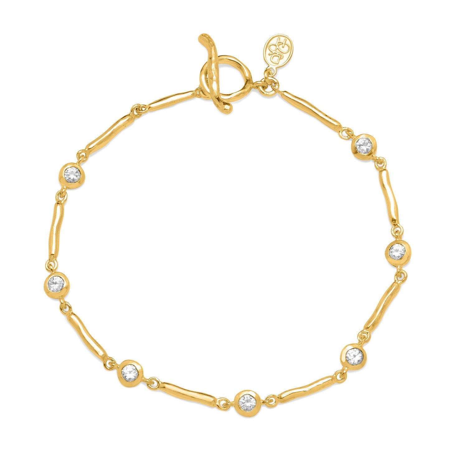 This White Sapphire Dewdrops Link Bracelet by Dower & Hall is perfect for adding a touch of sparkle to any outfit. Featuring seven white sapphires encased in dainty nugget settings with organic link spacers, it can be worn alone or stacked with other bracelets for a layered look. Fastened with a secure t-bar & loop catch, this bracelet is a versatile piece for both day and night.