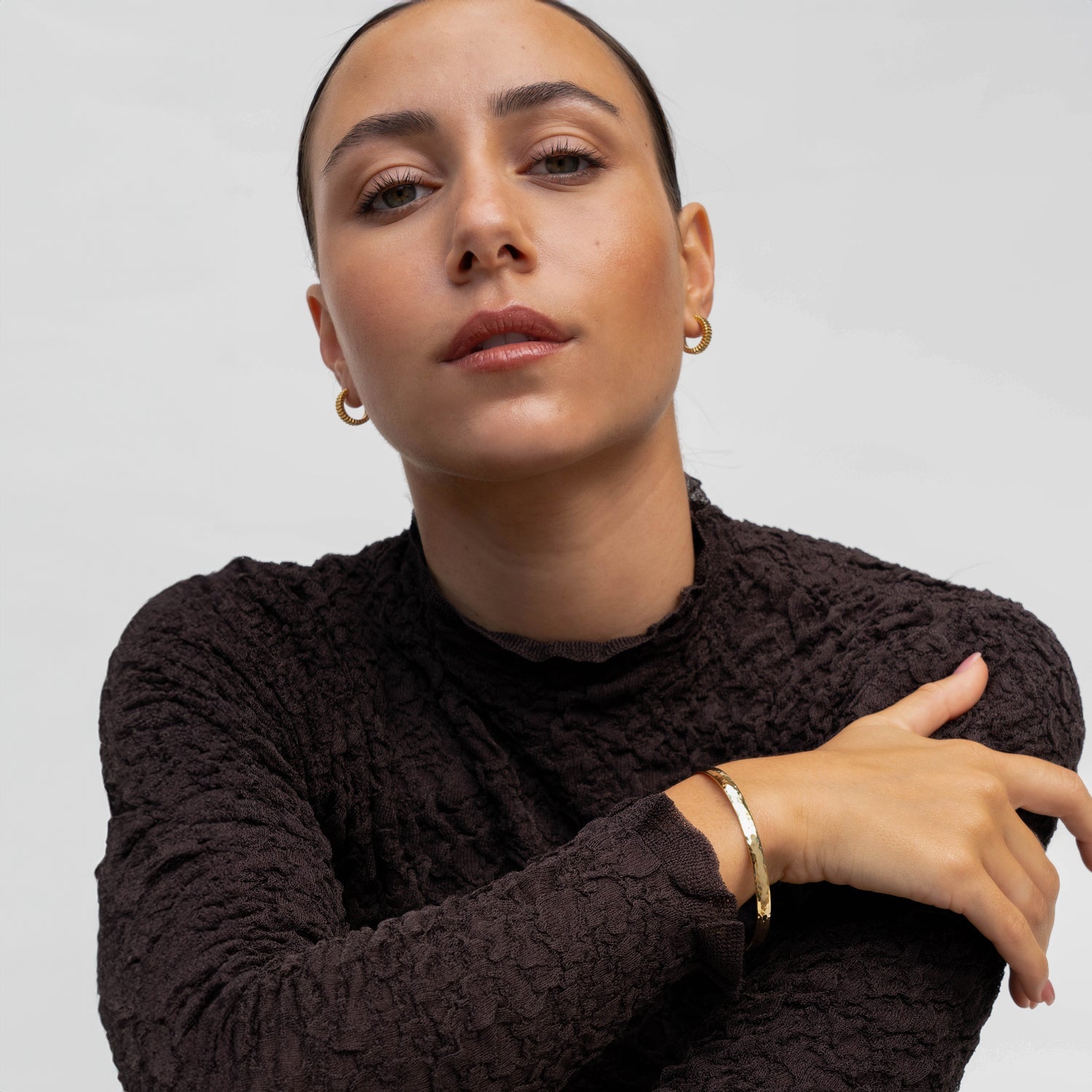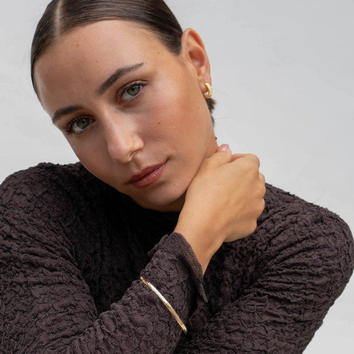 These Medium Humbug Huggie Hoops by Dower & Hall showcase a stylish humbug stripe design carved into sterling silver. The hoops have a unique ribbed texture that catches the light, making them perfect for adding subtle sophistication to any outfit. Available in sterling silver or with a radiant yellow gold vermeil finish.