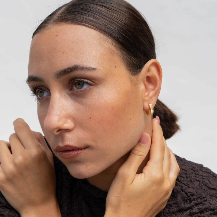 Available in sterling silver or 18ct yellow gold vermeil. Featuring a humbug stripe ribbed design. Hoop size - 15mm, width - 4mm.