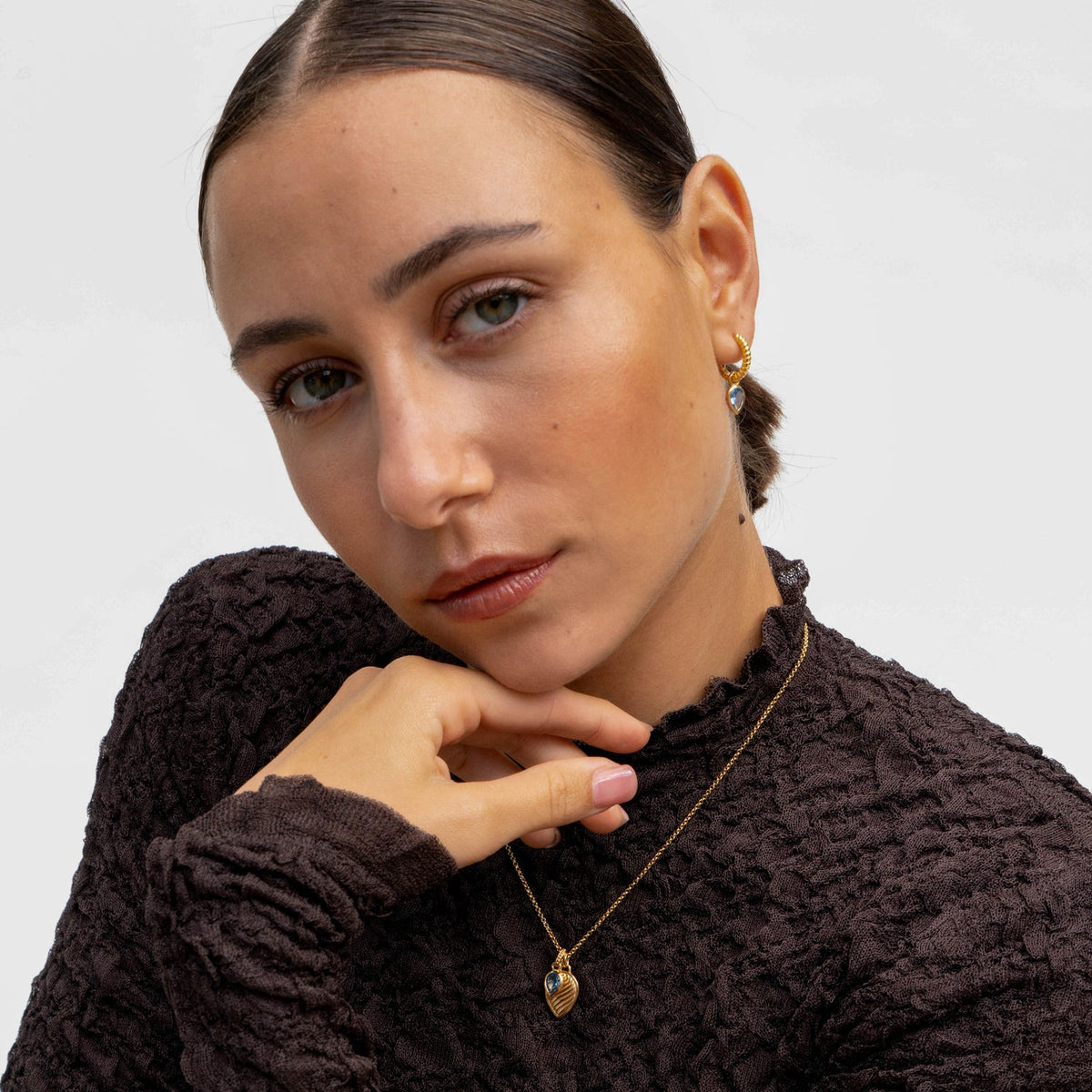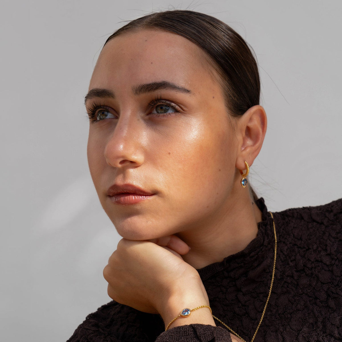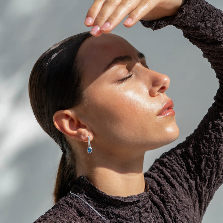 These Blue Topaz Twist Huggie Charm Hoops by Dower & Hall are designed to bring a serene touch to your jewelry collection. Made from sleek sterling silver, the hoops feature a distinctive 2mm hinged barley sugar twist style. The radiant blue topaz gemstones, measuring 7 x 5mm, captivate with their tranquil color. Perfect as a standalone piece or as a chic addition to your ear stack, these hoops blend timeless design with contemporary flair.