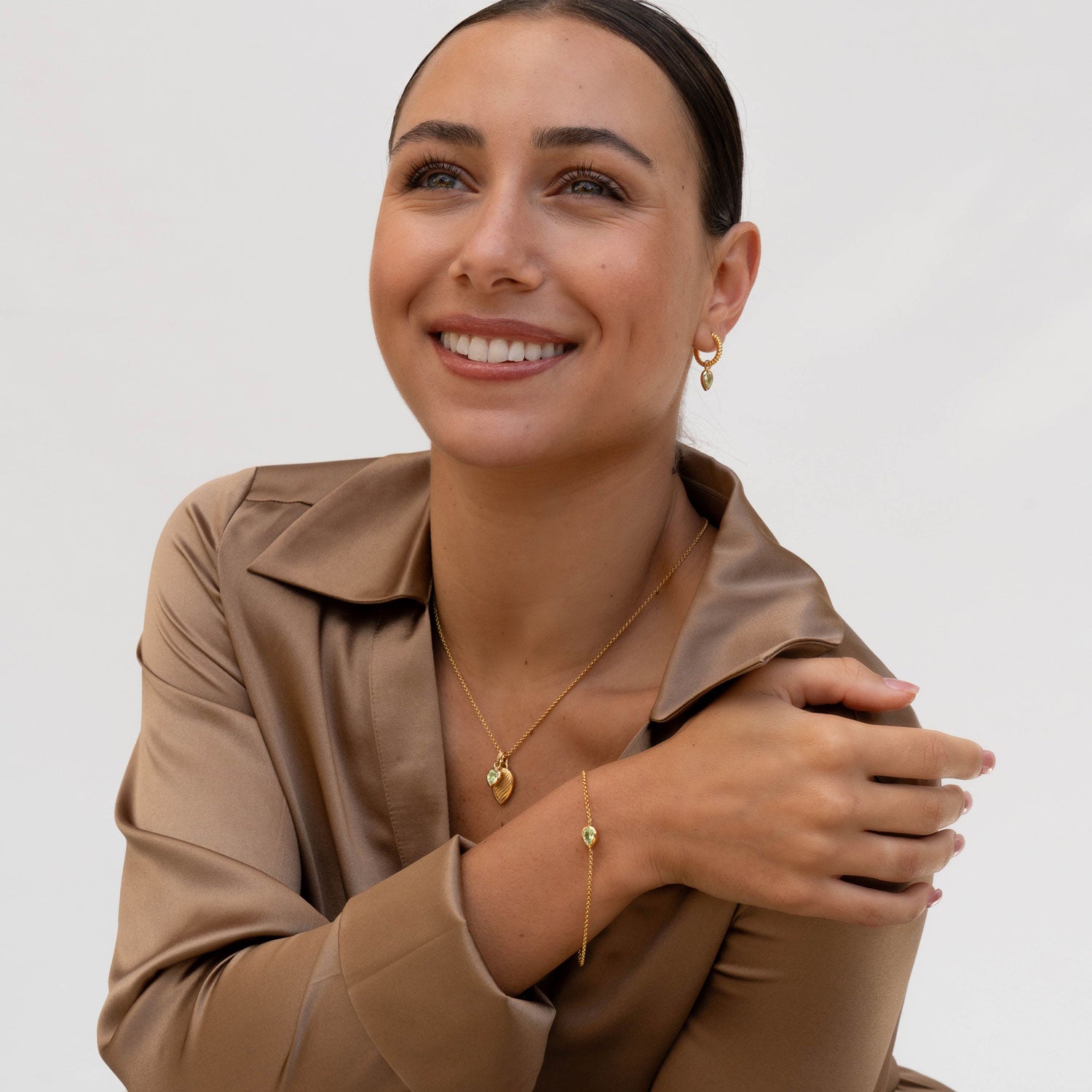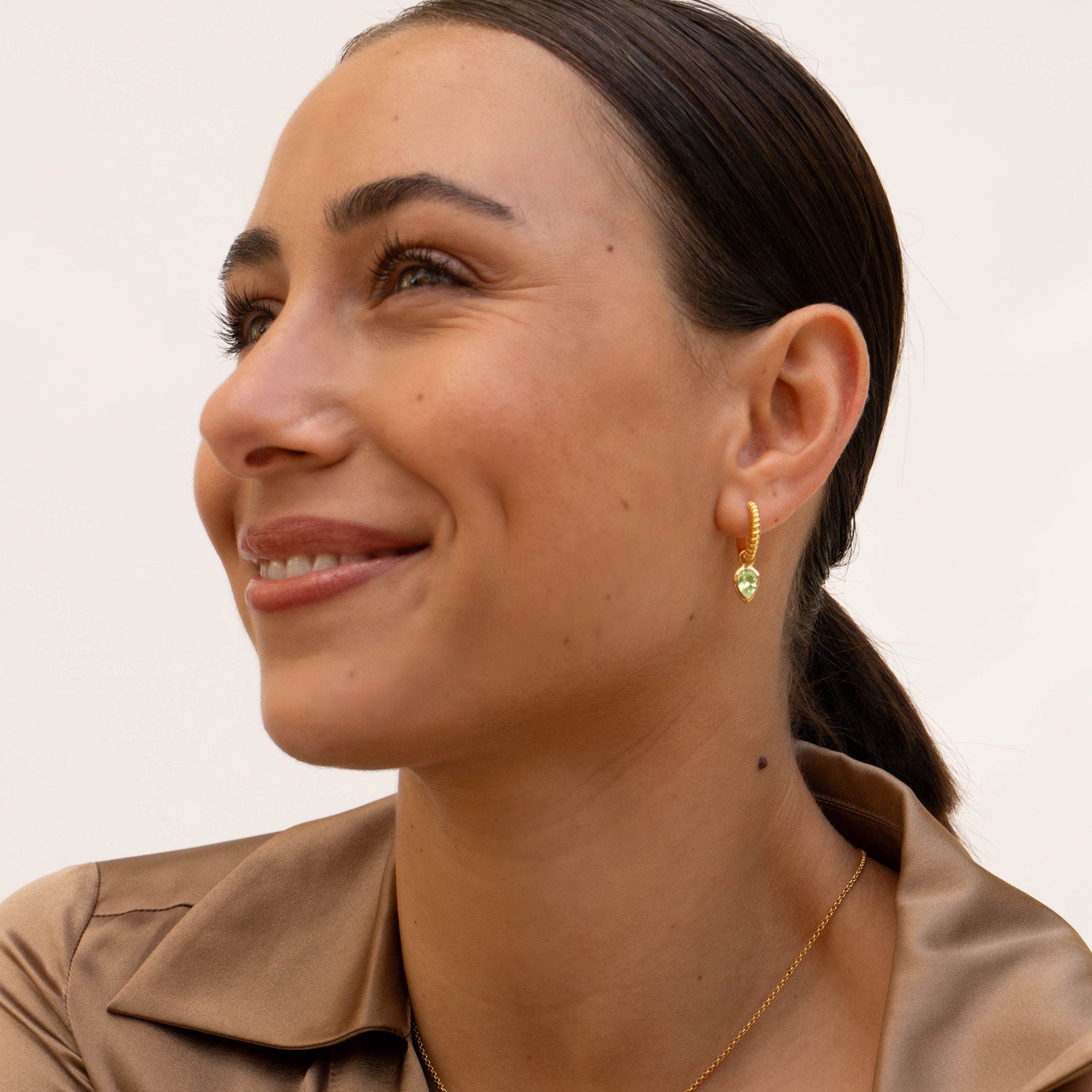 Handcrafted in sterling silver with peridot gemstones (7 x 5mm). Hoop size: 15mm. Available in sterling silver or 18ct yellow gold vermeil finish.