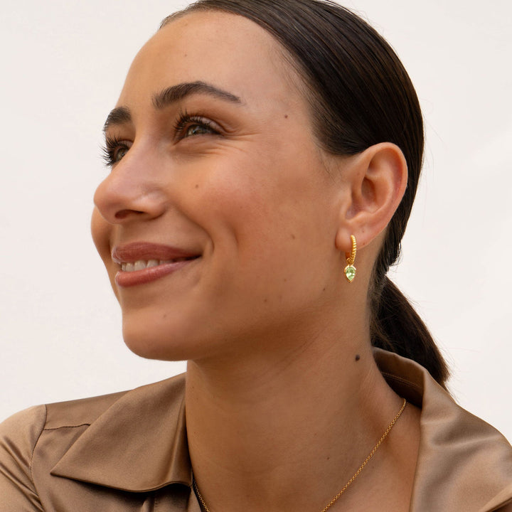 These Peridot Twist Huggie Charm Hoops by Dower & Hall offer an elegant design with a modern twist. The 2mm hinged barley sugar twist style hoops feature radiant peridot gemstones, known for their striking olive-green color. These earrings are perfect as a standalone piece or as part of a layered ear stack.