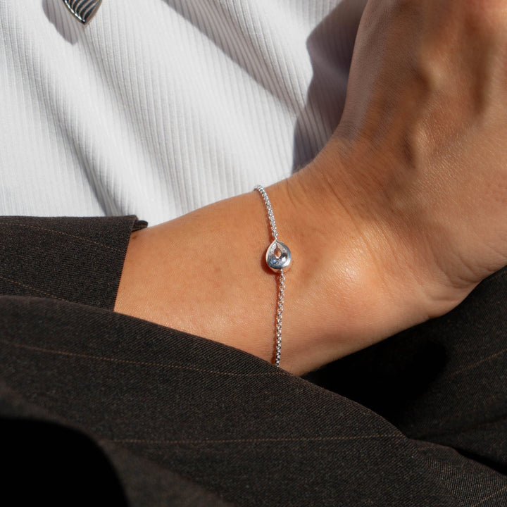 These White Topaz Pear Chain Bracelets by Dower & Hall are crafted from sterling silver and feature a striking pear-cut white topaz, perfect for pairing with any outfit. The bracelet is adjustable between 6.5 - 7.5 inches and can be worn alone or stacked for a layered look. Available in both sterling silver and radiant yellow gold vermeil finishes.