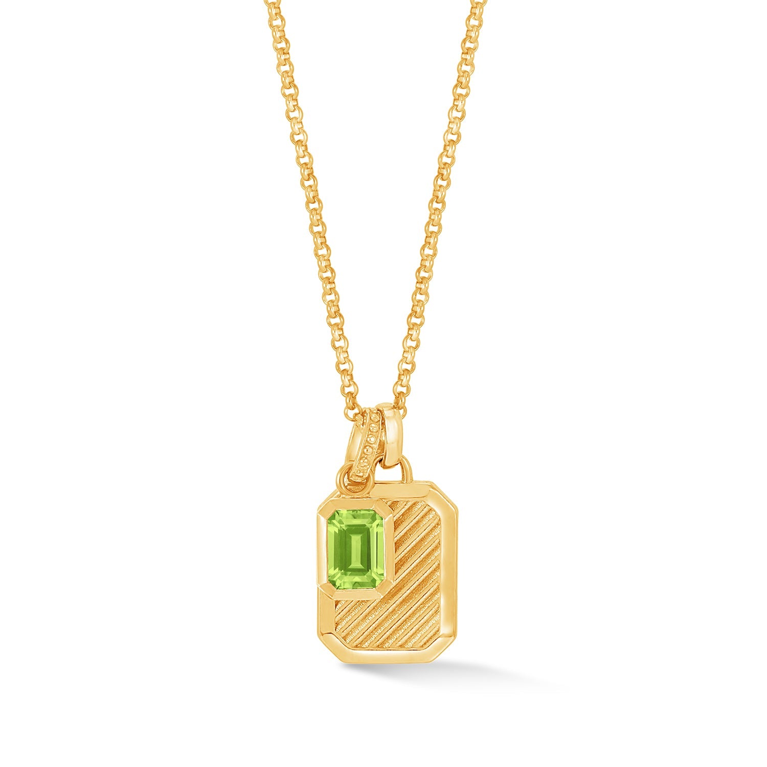 This Peridot Octagon Humbug Necklace by Dower & Hall is a perfect balance of colour and style. The lozenge-shaped pendant is carved with a humbug stripe design and paired with an eye-catching octagon peridot gemstone. This piece is available in both sterling silver and yellow gold vermeil finishes, making it a versatile addition to any jewelry collection.