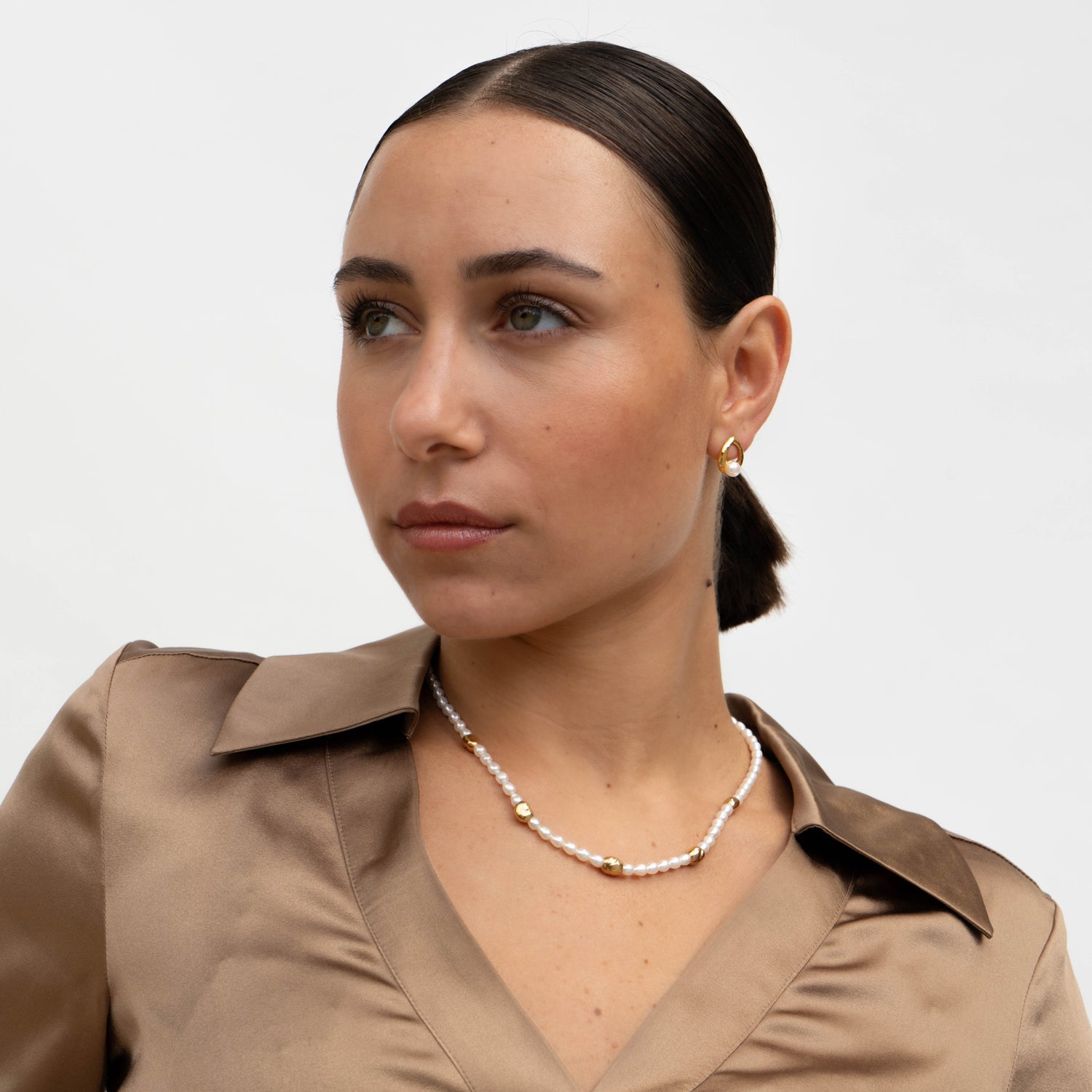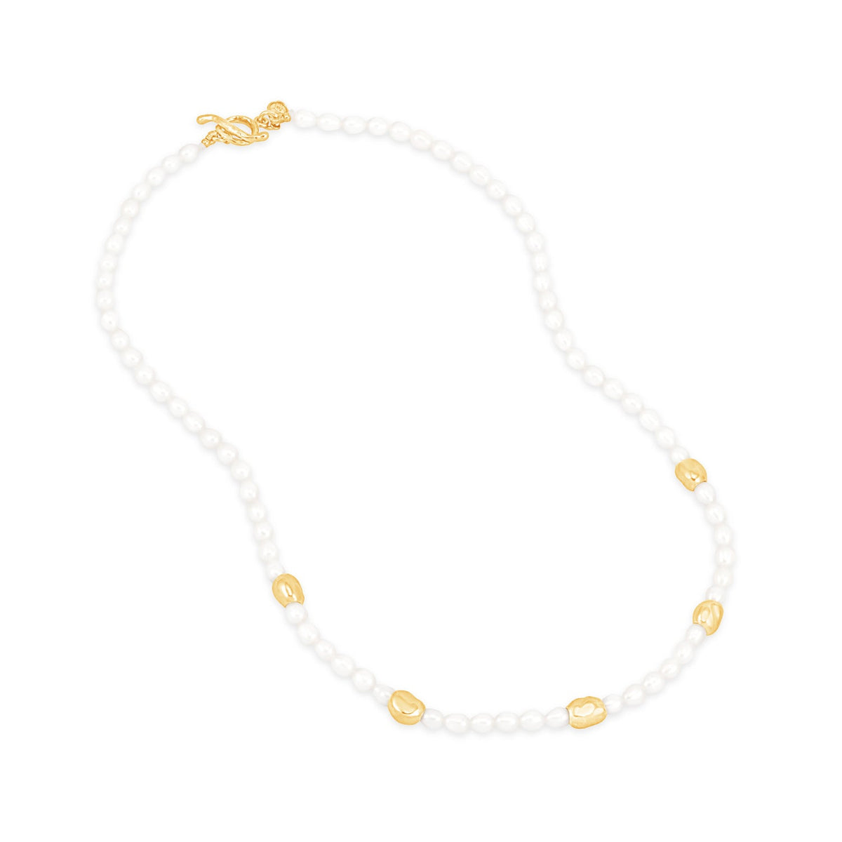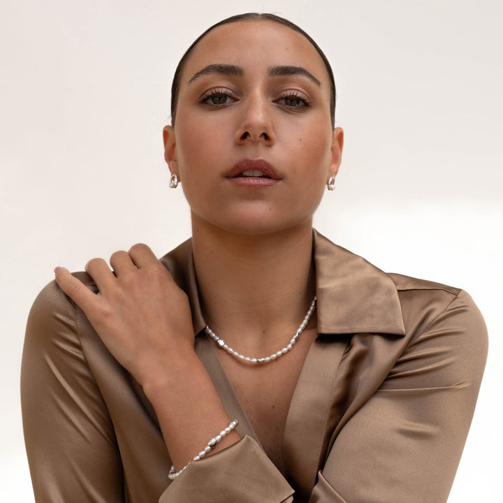 Handcrafted in sterling silver or with 18ct yellow gold vermeil finish. White freshwater pearls, ocean pebble beads. Pearl size: 5mm, Pebble size: 7-8mm.