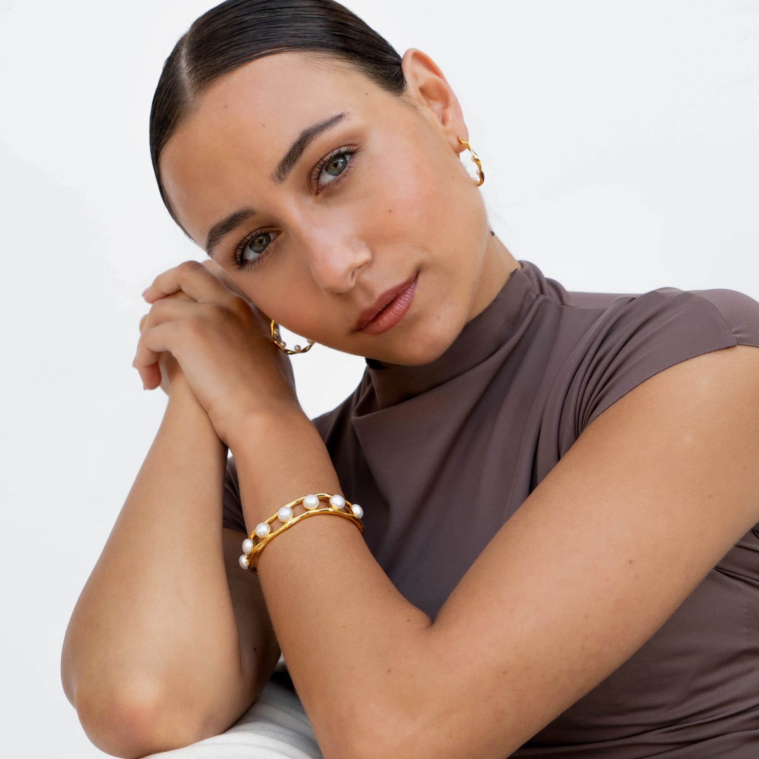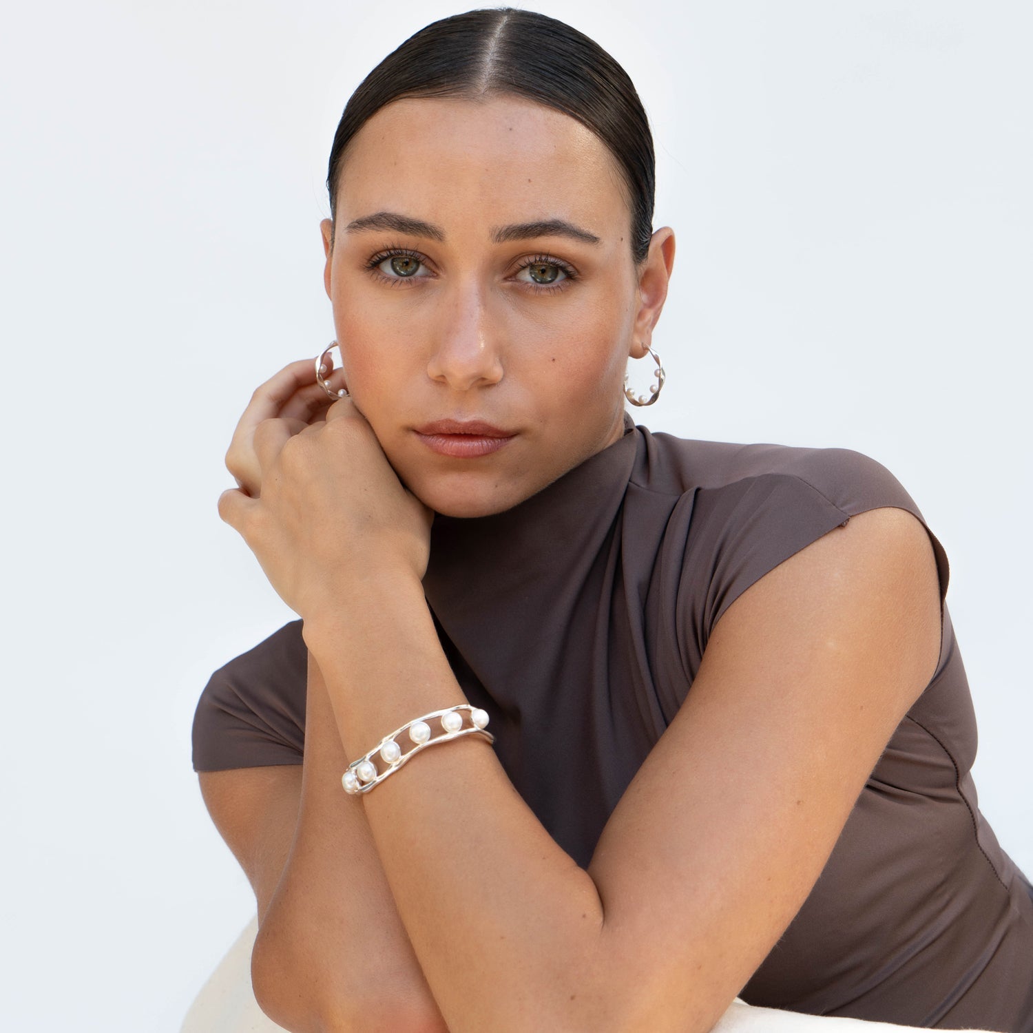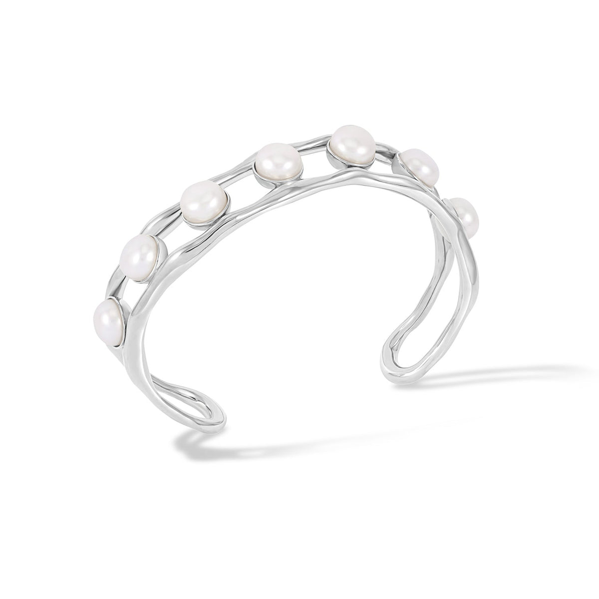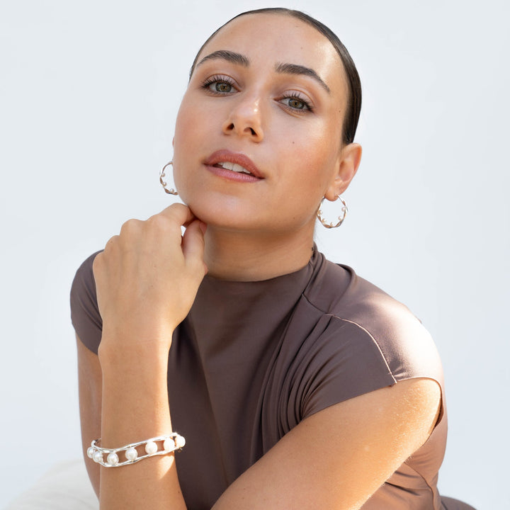 Sterling silver or 18ct yellow gold vermeil. White freshwater pearls (8mm). Bangle width: 15mm. Diameter: 60mm.