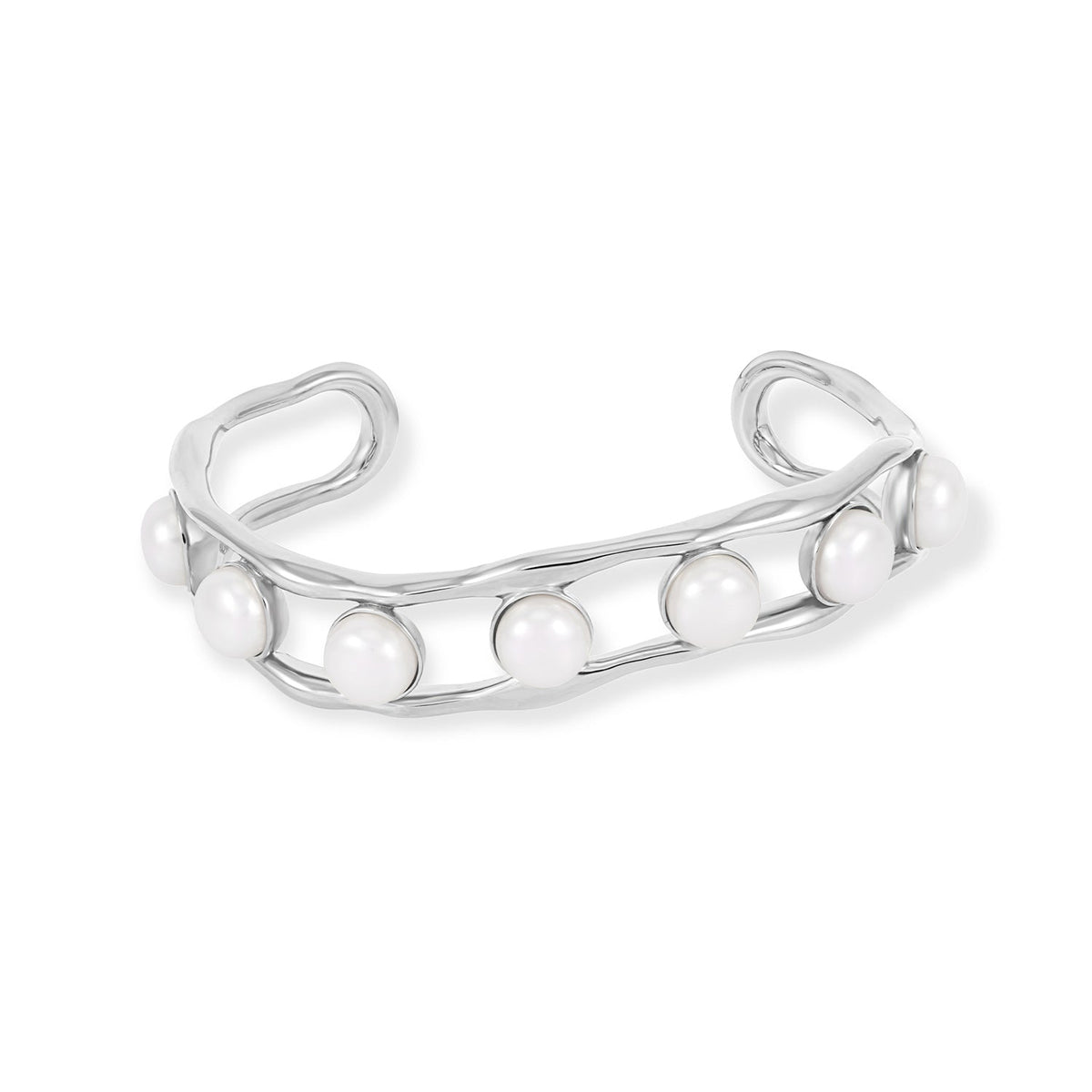 This Waterfall White Freshwater Pearl Chunky Bangle by Dower & Hall showcases a classic design with a modern twist. The chunky sterling silver cuff is set with seven large white freshwater pearls and features a subtle ripple pattern. Available in both sterling silver and yellow gold vermeil finishes, it's perfect for making a statement at any occasion.
