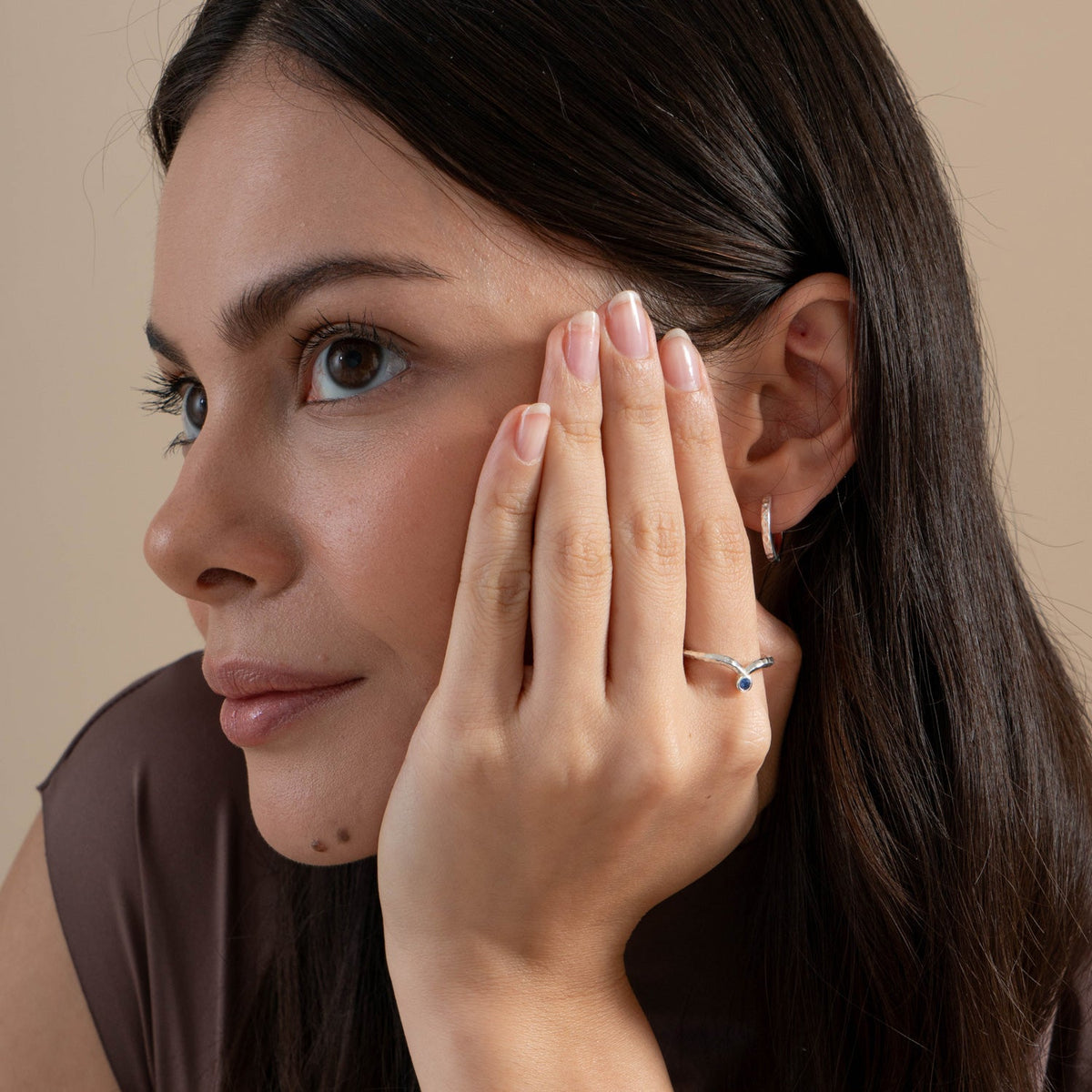 This Sapphire Wish Twinkle Ring by Dower & Hall is a beautiful addition to the Twinkle collection. The 2mm wide wishbone ring is crafted in sterling silver and engraved with the word 'Wish' on the inside. A 2.5mm blue sapphire adds a perfect pop of color to this delicate band, making it ideal for stacking or wearing alone.
