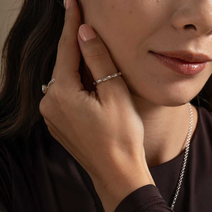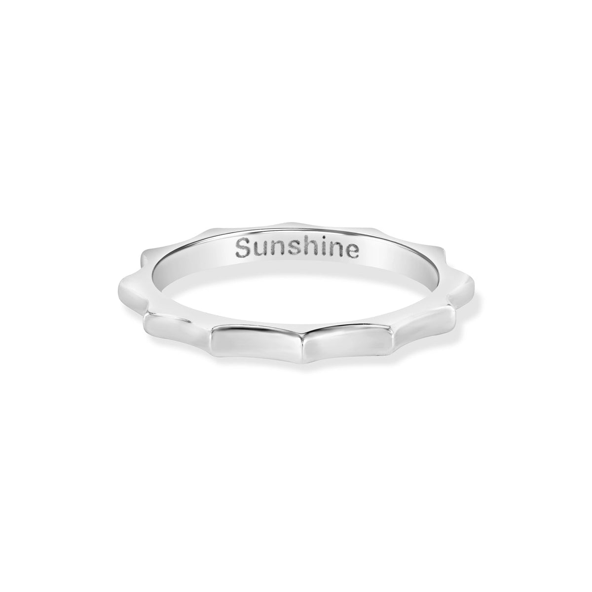 This Sunshine Twinkle Ring by Dower & Hall is a new addition to the Twinkle collection. The 2mm wide stacking ring is crafted in sterling silver with angular designs that resemble rays of sunshine. Engraved with 'Sunshine' on the inside, it symbolizes energy, power, and positivity. The ring is perfect for building a customized stack or wearing solo.