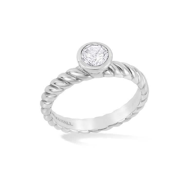 Handmade in sterling silver. Featuring a 5mm round faceted white topaz set on a barley sugar twist style band. Width - 4 x 1.8mm. Available in sizes J-P.