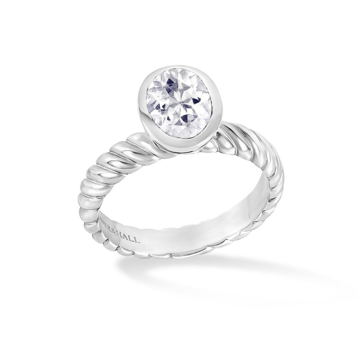 Handmade in sterling silver. Featuring an 8 x 6mm oval faceted white topaz set on a barley sugar twist style band. Width - 4 x 1.8mm. Available in sizes J-S.