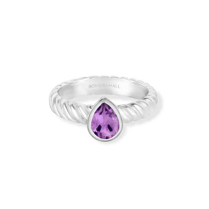 This Amethyst Pear Twist Twinkle Ring by Dower & Hall is a stackable sterling silver design featuring a 7 x 5mm pear-cut faceted amethyst. The barley sugar twist style band adds texture and dimension, making this ring perfect for wearing alone or stacked with other Twinkle rings to create a personalized look. Available in sizes J-S, with custom sizes available on request.