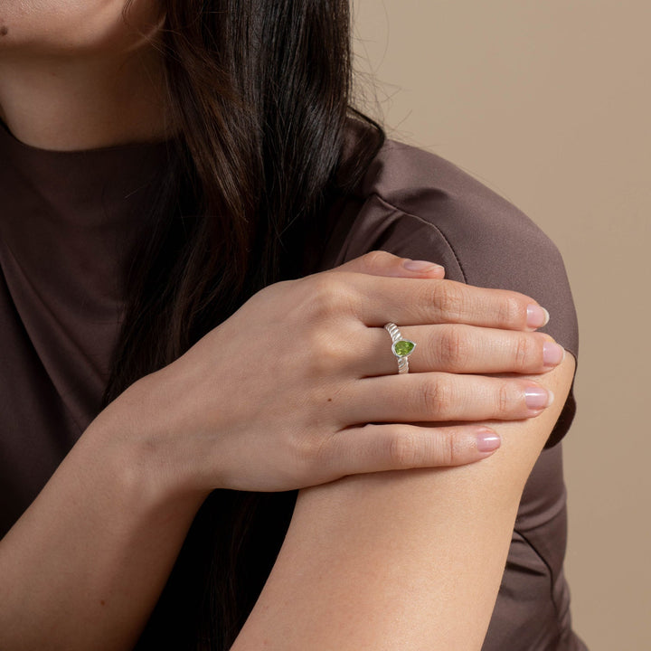 Handmade in sterling silver. Featuring a 7 x 5mm pear-cut faceted peridot set on a barley sugar twist style band. Width - 4 x 1.8mm. Available in sizes J-S.