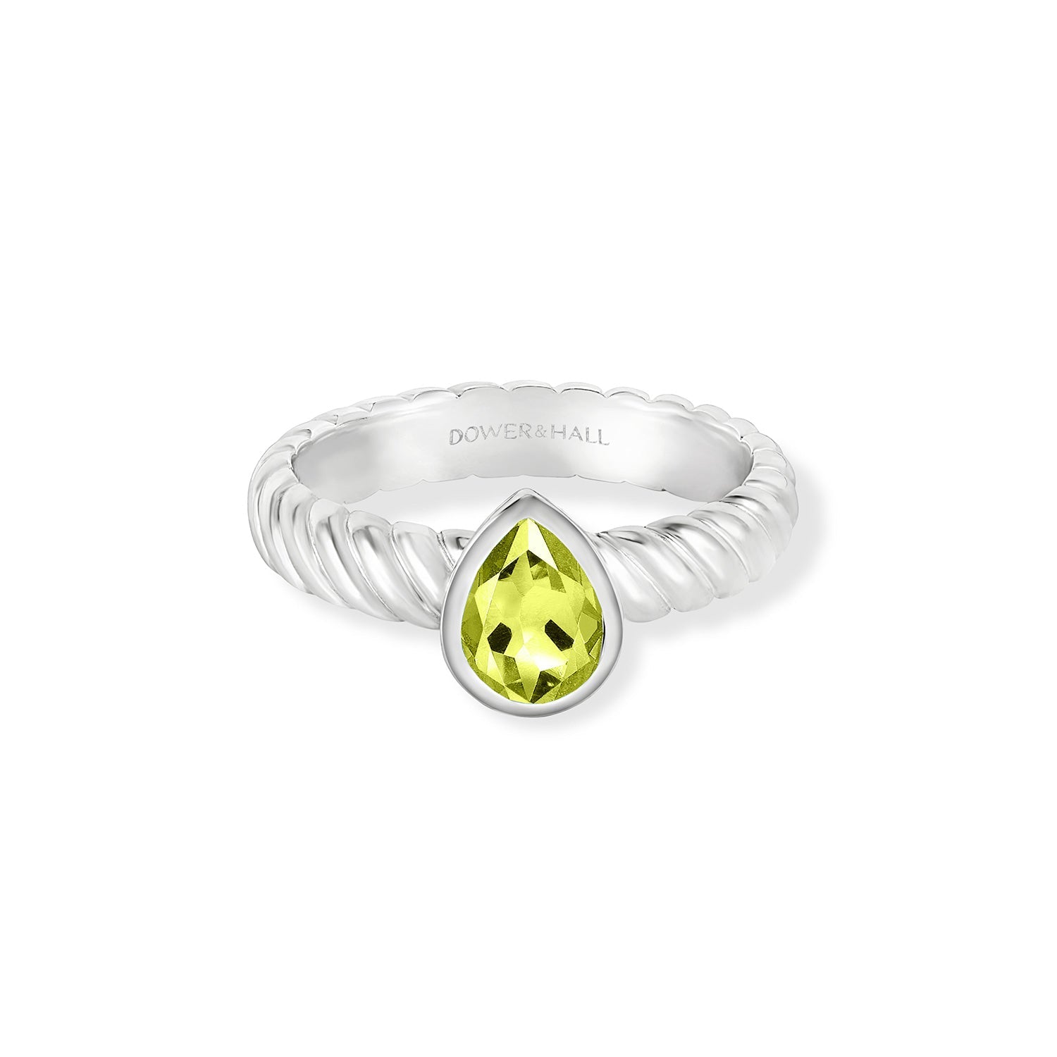 This Peridot Pear Twist Twinkle Ring by Dower & Hall features a 7 x 5mm pear-cut faceted peridot set on a barley sugar twist style band. Perfect for wearing alone or stacking with other Twinkle rings, this sterling silver ring brings a pop of vibrant green to your jewelry collection. Available in sizes J-S, with custom sizes available on request.