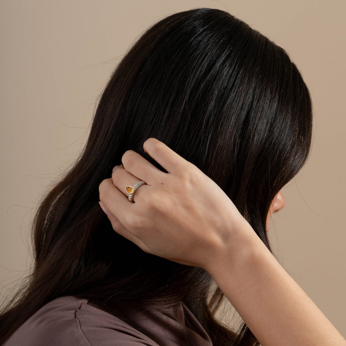 This Citrine Pear Twist Twinkle Ring by Dower & Hall features a 7 x 5mm pear-cut faceted citrine set on a barley sugar twist style band. This stackable sterling silver ring is perfect for adding a pop of yellow to your collection, whether worn alone or stacked with other Twinkle rings. Available in sizes J-S, with custom sizes available on request.
