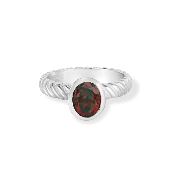 Handmade in sterling silver. Featuring an 8 x 6mm oval faceted garnet set on a barley sugar twist style band. Width - 4 x 1.8mm. Available in sizes J-S.