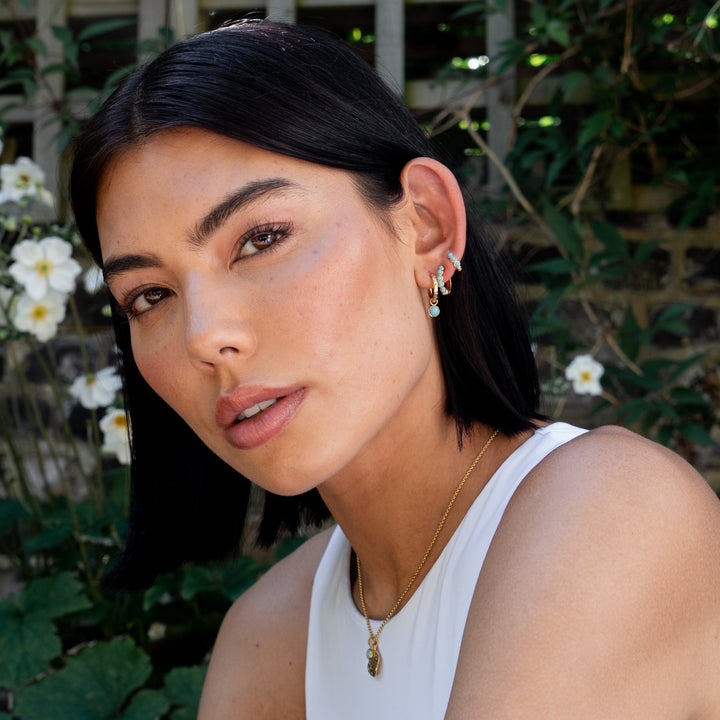 Crafted in sterling silver with a 5mm turquoise gemstone. Hoop size: 15mm. Features a detachable turquoise drop. Available in both sterling silver and 18ct yellow gold vermeil finish.