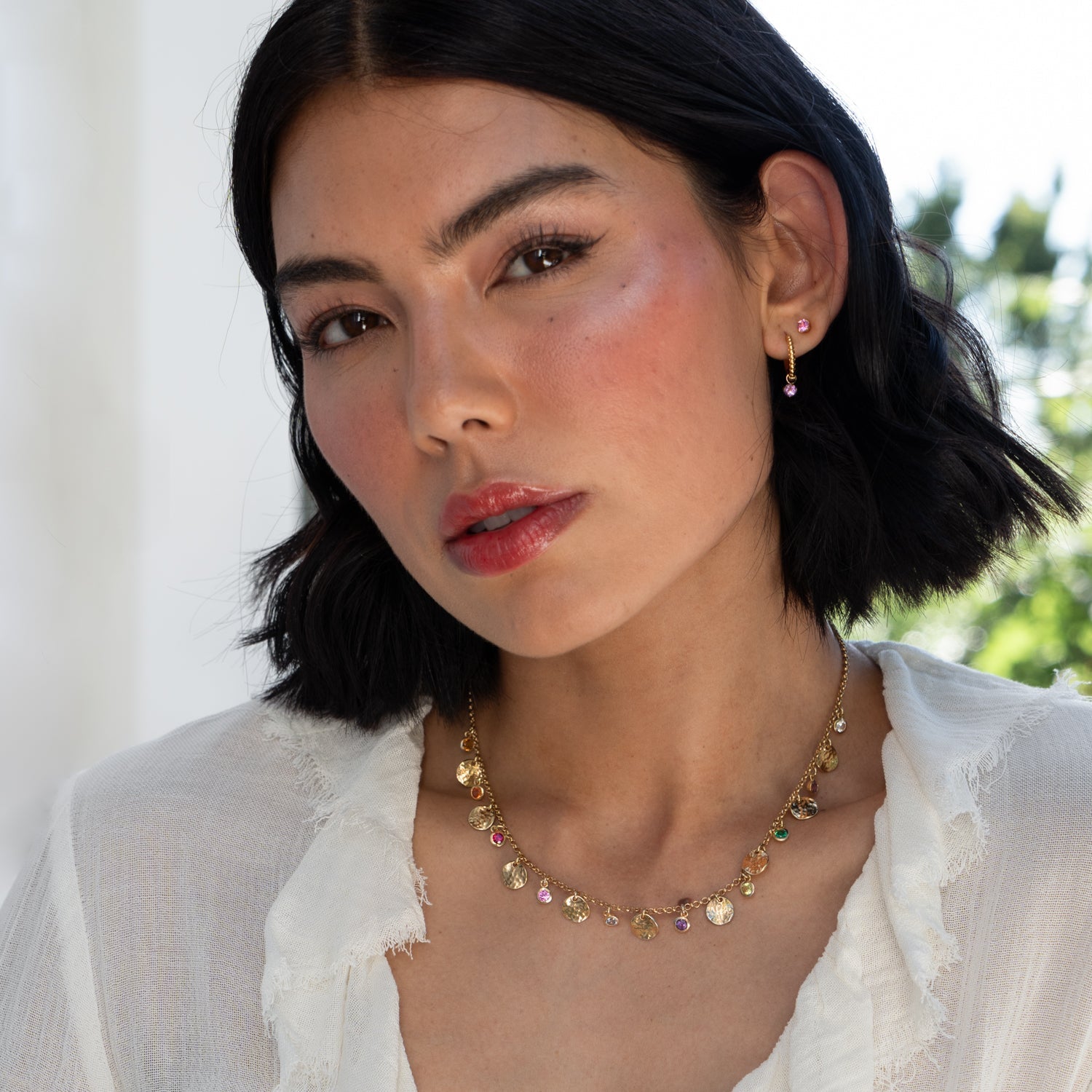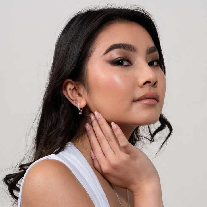 These Amethyst Orissa Hoops by Dower & Hall feature a signature dotty texture and a lotus bud charm drop set with a 4mm amethyst gemstone. Available in either sterling silver or a radiant 18ct yellow gold vermeil finish, these huggie hoops add a touch of color and elegance to any ensemble. Their contemporary design is perfect for both casual and formal occasions.