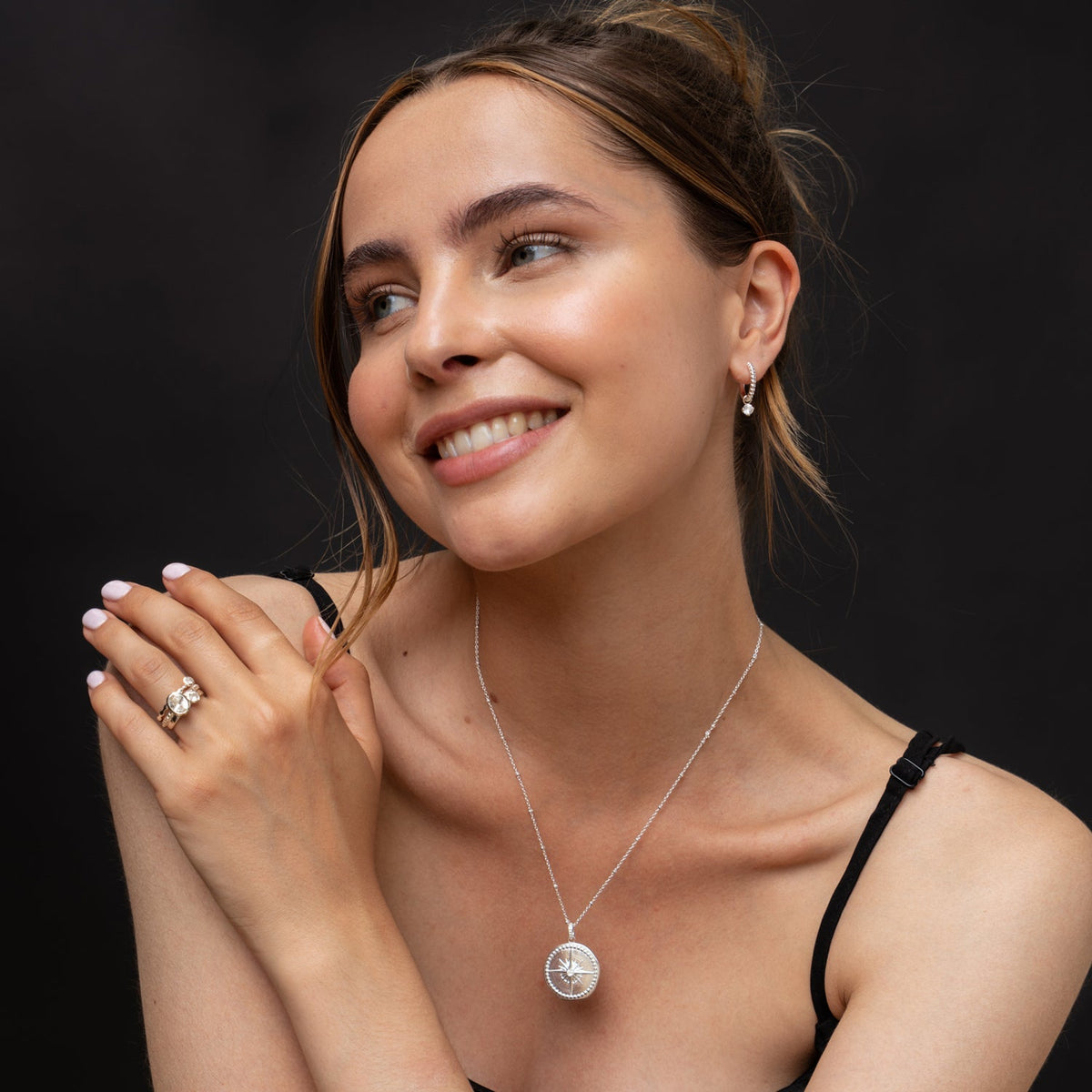 Available in sterling silver or 18ct yellow gold vermeil. Featuring a 4mm white topaz gemstone set in a lotus bud charm drop. Hoop size - 15mm.