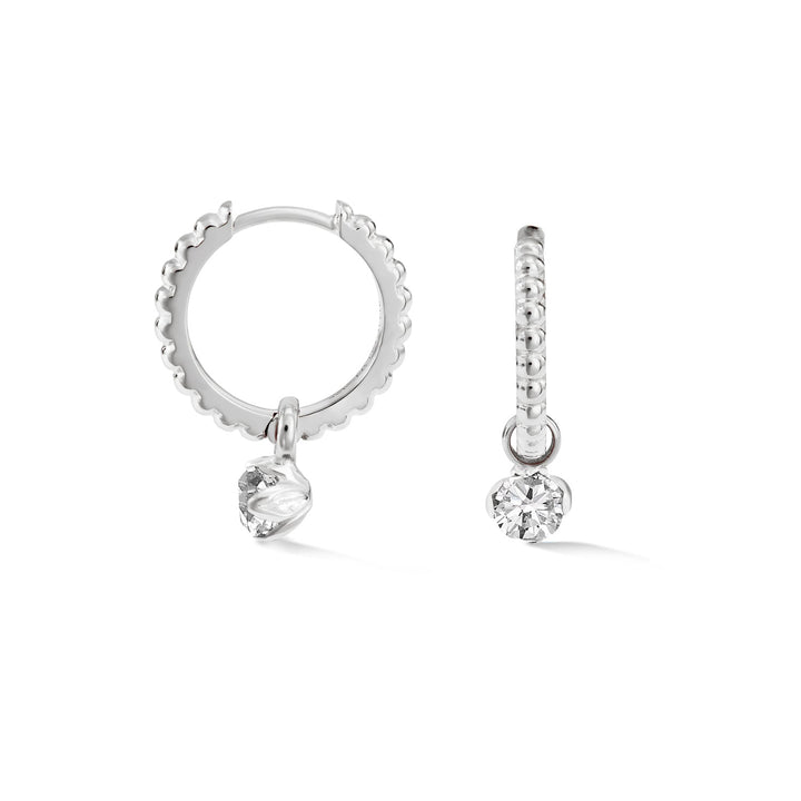 These White Topaz Orissa Hoops by Dower & Hall feature a signature dotty texture and a lotus bud charm drop set with white topaz gemstones. Available in either sterling silver or a radiant 18ct yellow gold vermeil finish, these hoops offer a modern twist on classic design. Their versatile style makes them perfect for both everyday wear and special occasions.
