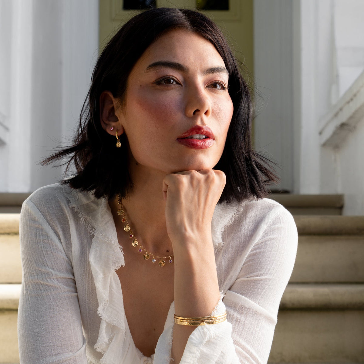 These Hammered Disc Nomad Hoops by Dower & Hall combine the signature hammered finish with a matching disc charm drop, creating a unique and modern design. Available in either sterling silver or with a radiant 18ct yellow gold vermeil finish, these hoops are perfect for adding texture and dimension to your look.