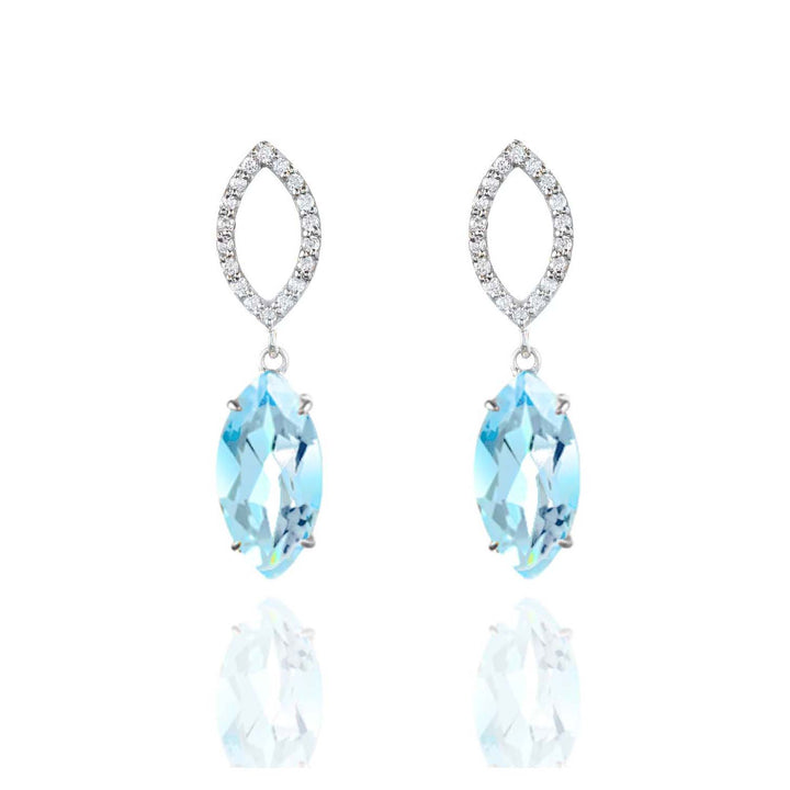 Set in 9ct white gold with marquise-cut sky blue topaz measuring 10mm x 5mm, accented by diamonds in a marquise-shaped setting. Earrings length: 21mm.