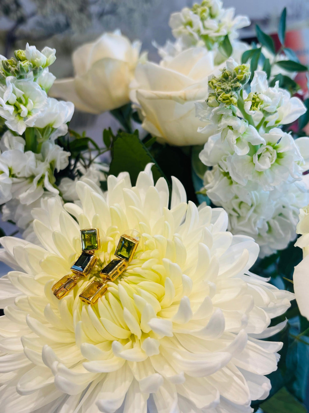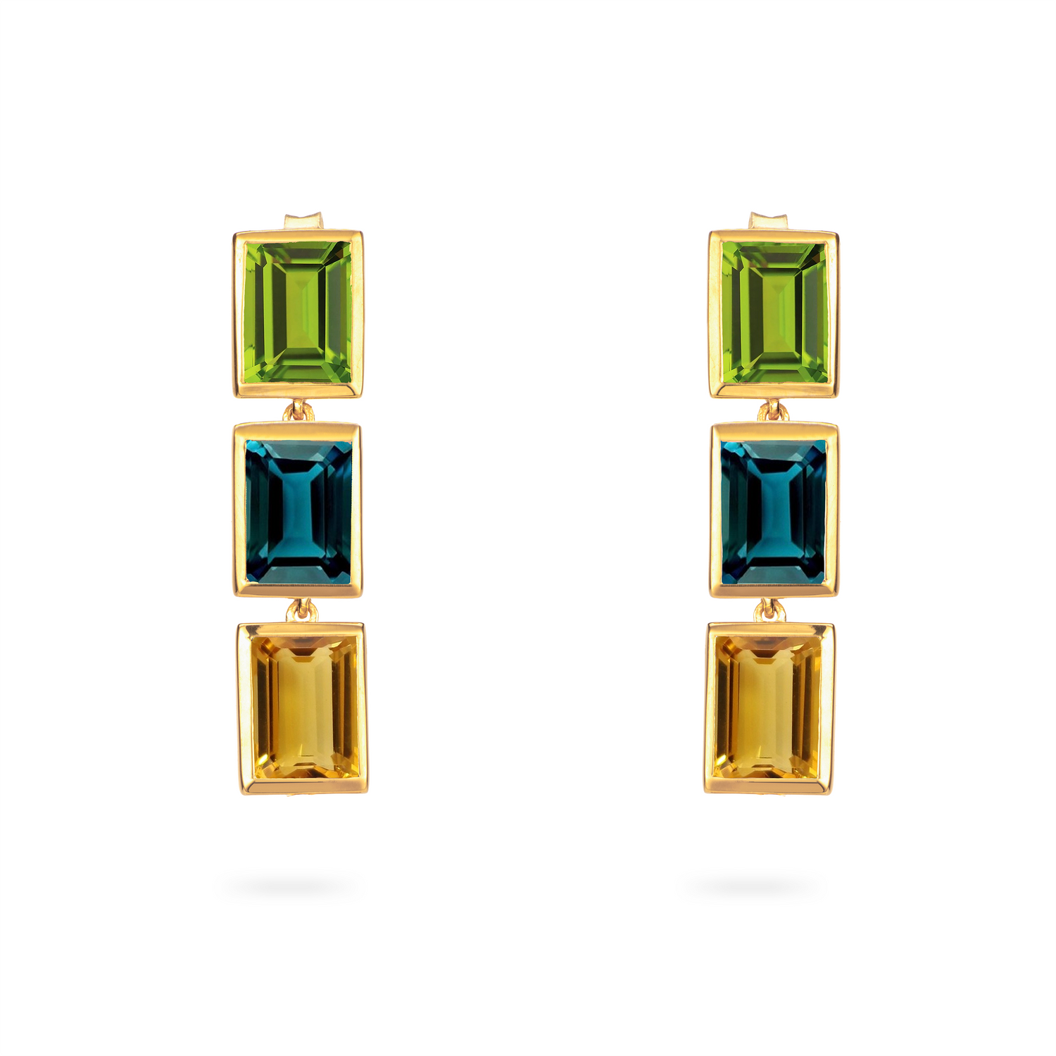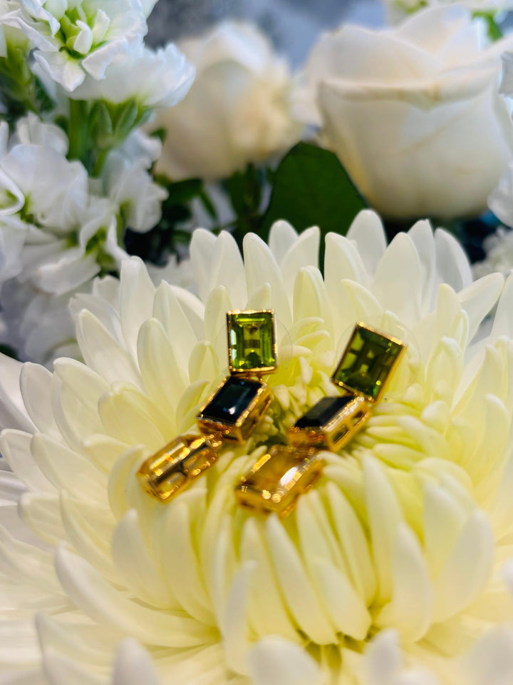 These Peridot, London Blue Topaz, and Citrine 3 Drop Earrings by Augustine Jewels combine three stunning 6x8mm octagon-cut gemstones to capture the Northern Lights' beauty. Measuring 3.3cm in length, these earrings feature a combined total carat weight of 10.72ct and are available in Yellow Gold Vermeil, 9ct Yellow Gold, and 14ct Yellow Gold.