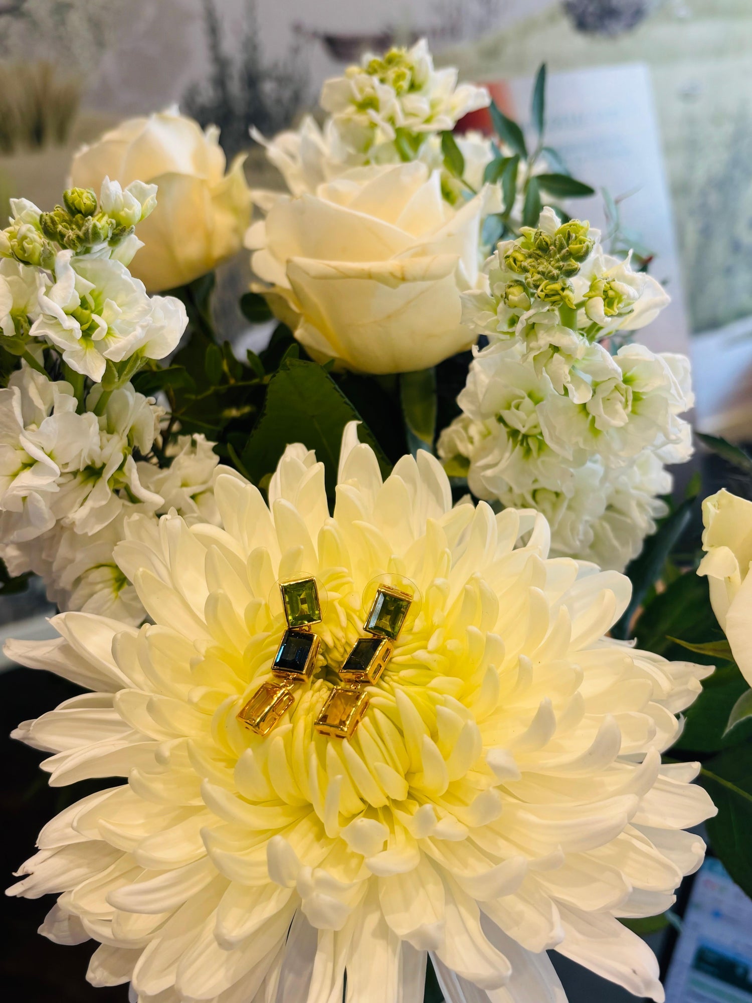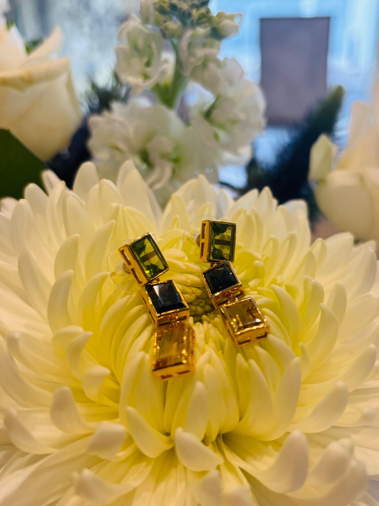 Peridot, London Blue Topaz and Citrine 3 Drop Earrings