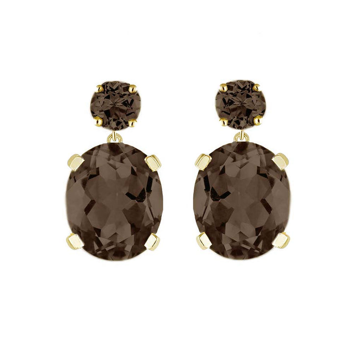Set in yellow gold plated sterling silver or 9ct yellow gold. Features 6mm round smoky quartz studs and 10x12mm smoky quartz drop stones.