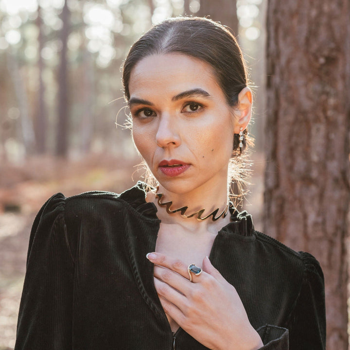 This Yellow Gold Vermeil Wedeln Torc by Augustine Jewels captures the dynamic and exclusive spirit of Gstaad’s powder skiing patterns. Designed by British jewelers and inspired by the fluid, repeated outlines of the Wedeln skiing technique, the torc reflects alpine luxury through 18ct yellow gold plating over sterling silver, sparkling white topaz and diamonds, and deep teal blue topaz gemstones representing the skies above Gstaad. A statement piece of rare beauty, power, and exclusivity, it’s perfect for those seeking bold, luxurious custom jewelry.
