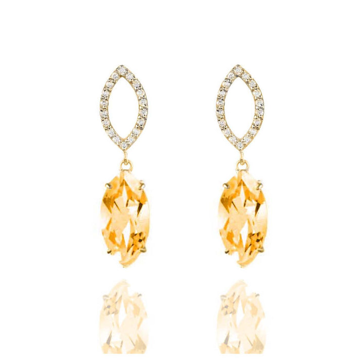 Handcrafted in 9ct yellow gold. Marquise-cut citrine 10mm x 5mm. Diamonds in marquise ring setting. Earrings length 21mm.