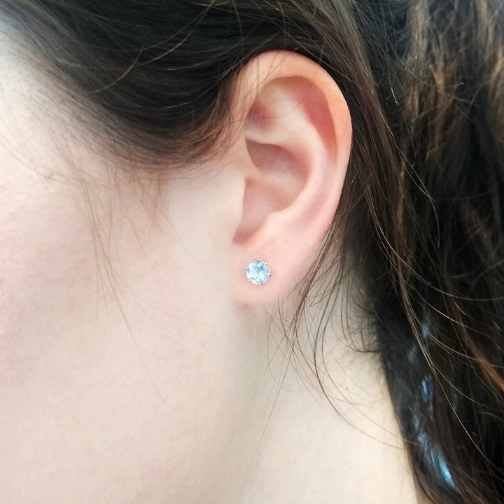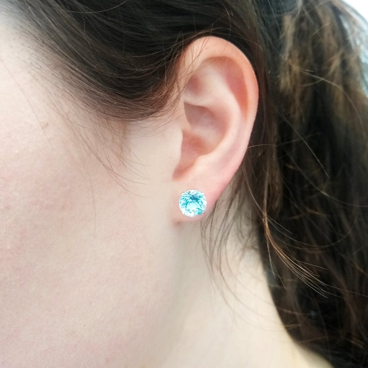 Solid sterling silver with butterfly/scroll style backs. Round-cut sky blue topaz stones measuring 6mm or 8mm. Bespoke 9ct or 18ct white gold available on request. Crafted with precision.