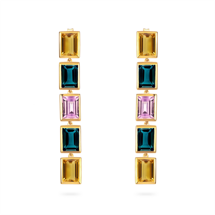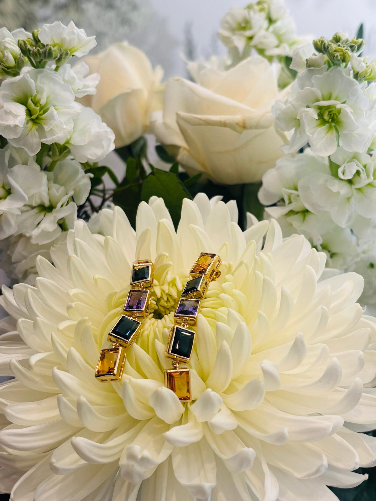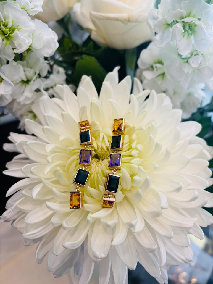 Crafted in Yellow Gold Vermeil, 9ct Yellow Gold, or 14ct Yellow Gold. Features 6x8mm octagon cuts of Citrine, London Teal Topaz, and Purple Amethyst. Total carat weight 16.18ct. Length 5.5 cm.
