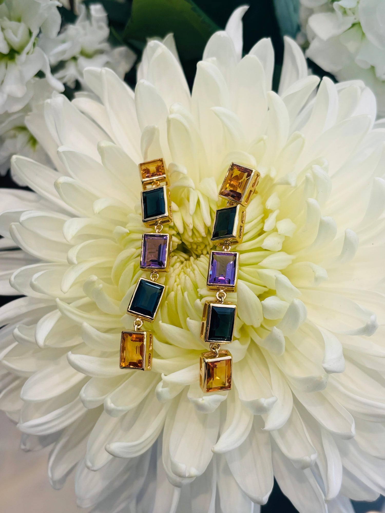 Citrine, London Blue Topaz and Purple Amethyst 5 Drop Earrings